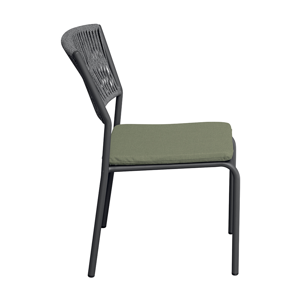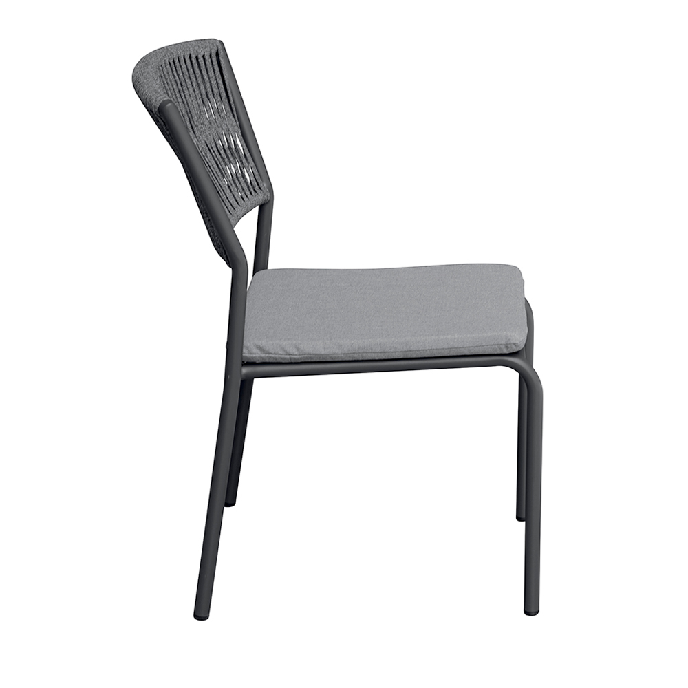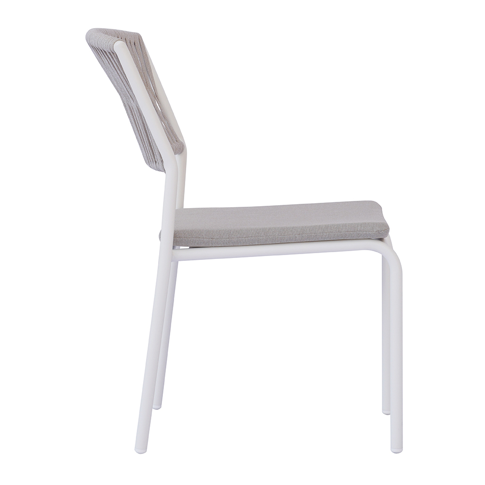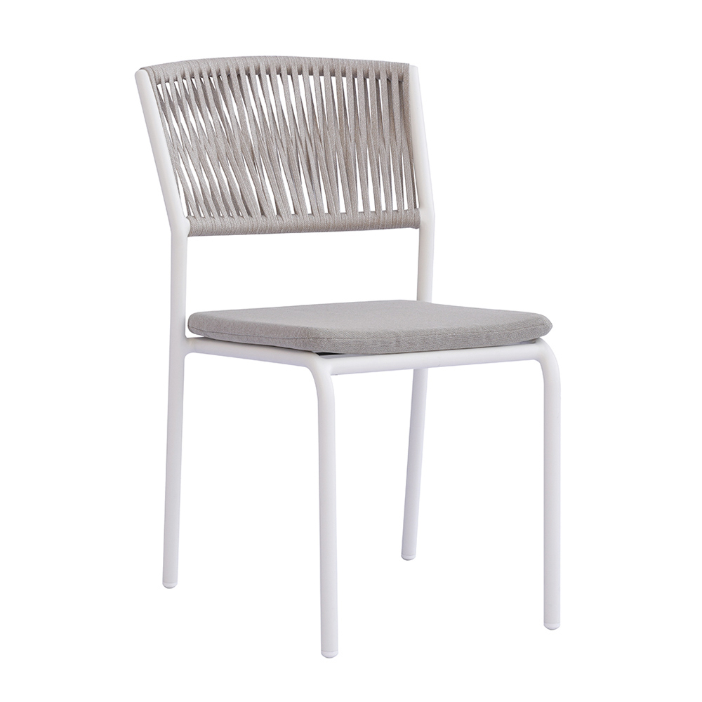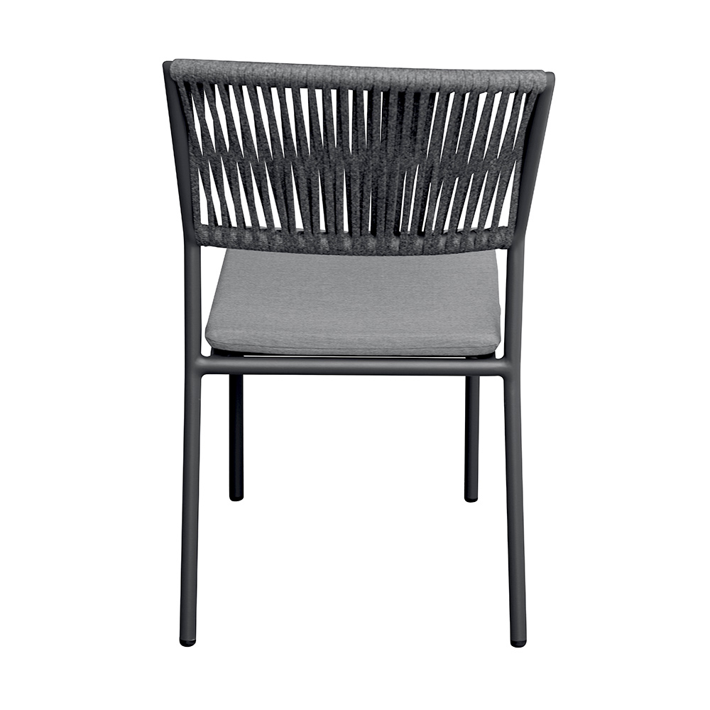 El respaldo de cuerda para exterior añade un toque refinado y contemporáneo, garantizando comodidad y transpirabilidad, mientras que el asiento de aluminio con cojín a juego ofrece suavidad y comodidad, haciendo que cada momento de relajación sea aún más agradable.