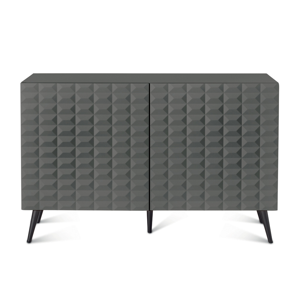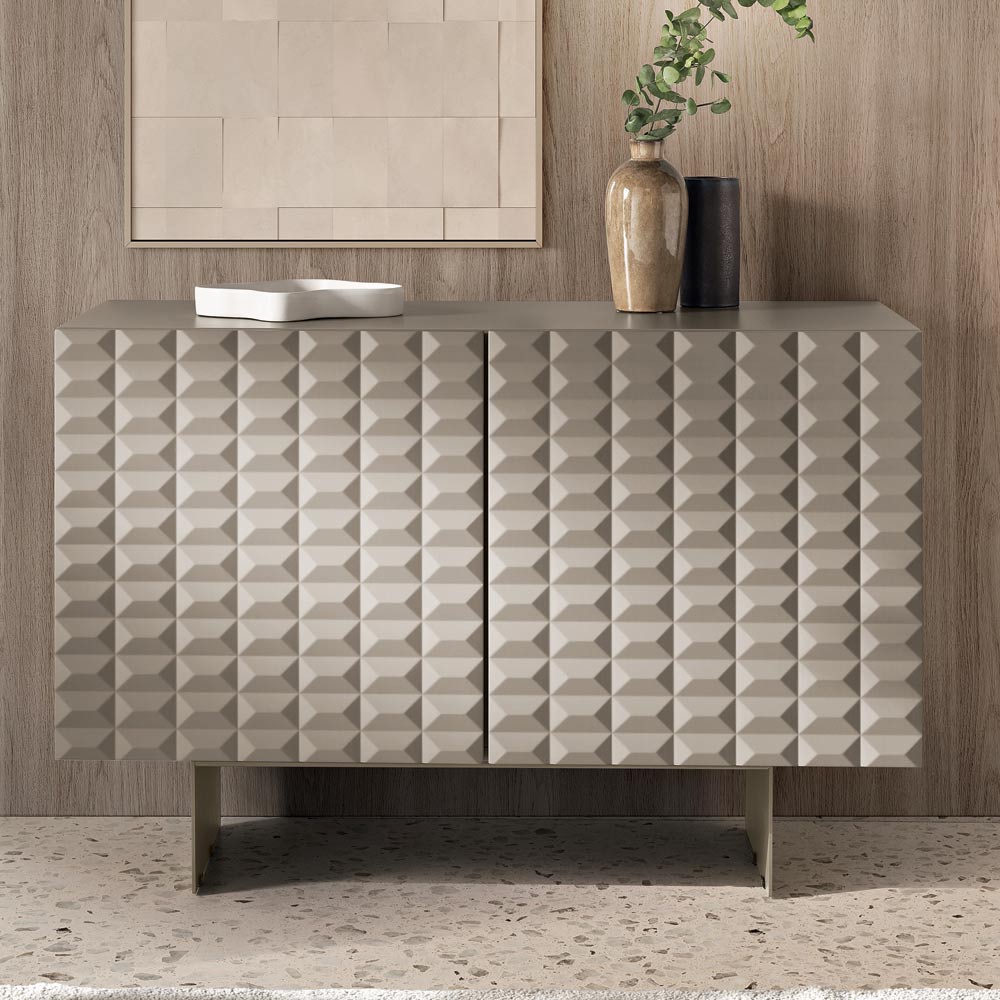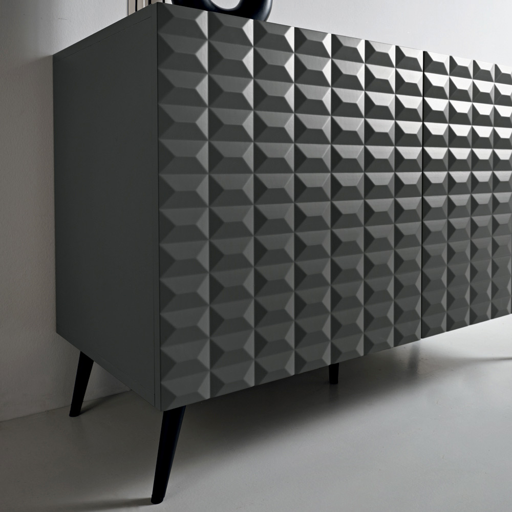Aparador de diseño fabricado en Italia con puertas tridimensionales en forma de diamante y base metálica.