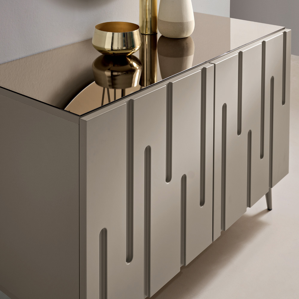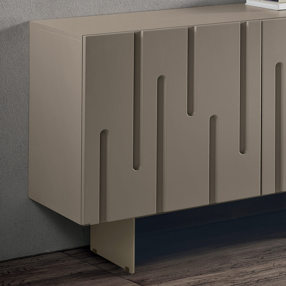 Las puertas de MDF revestidas de PVC presentan incisiones verticales irregulares que evocan el flujo natural de estalactitas y estalagmitas , creando un efecto refinado, texturizado y dinámico. Este juego de relieves aporta profundidad y movimiento a la superficie, realzando la luz y convirtiendo el aparador en la pieza central del espacio.