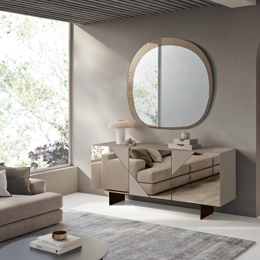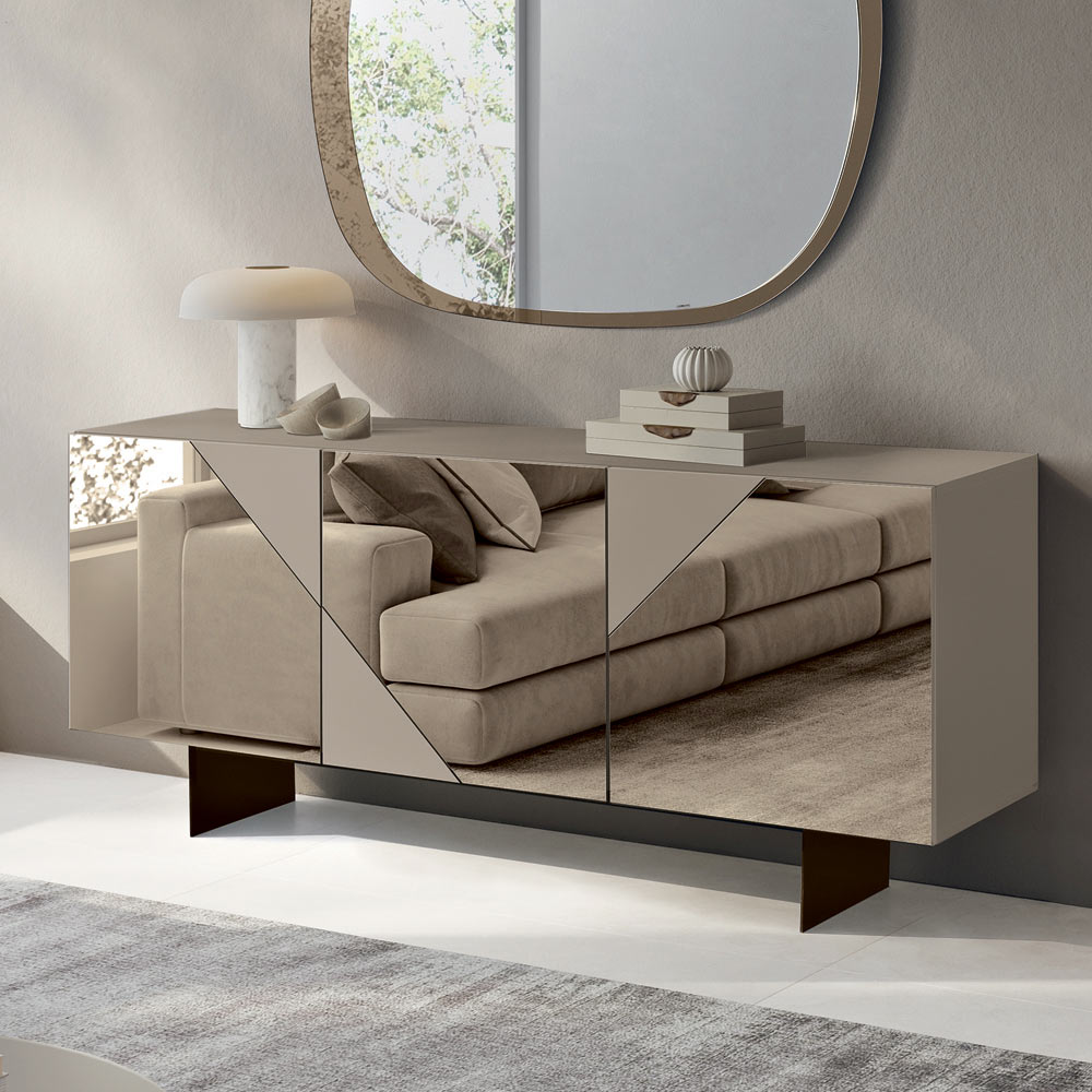 Las puertas de MDF están revestidas con cristal espejado que alterna superficies brillantes y mates , creando un refinado juego geométrico que captura la luz y aporta profundidad visual. Este contraste de materiales confiere al aparador un aspecto elegante y dinámico, ideal para espacios modernos y sofisticados.
