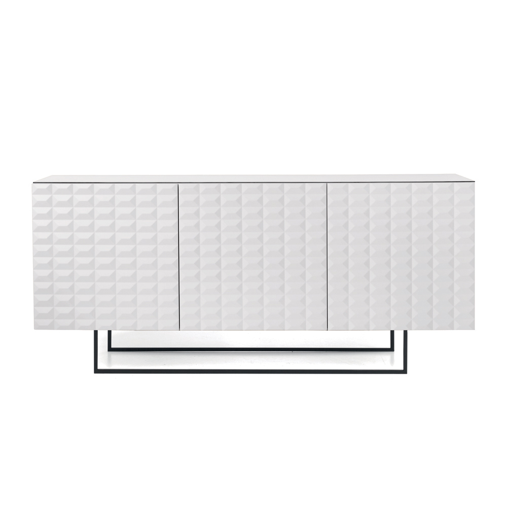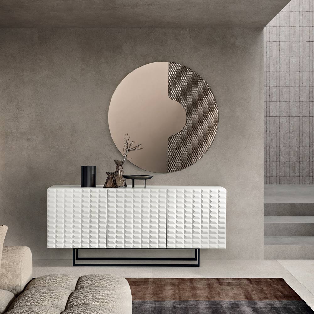 Las puertas de MDF revestidas de PVC presentan una textura geométrica tridimensional que recuerda a los famosos relieves de rombos , creando un fascinante juego de luces y sombras. Este detalle añade profundidad visual y convierte al aparador en el centro de atención de la habitación.