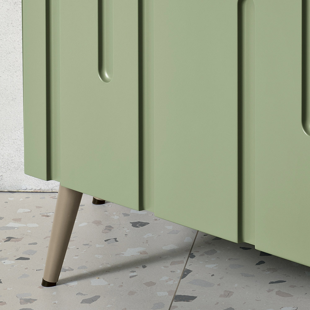 Las puertas de MDF revestidas de PVC presentan incisiones verticales irregulares que evocan el flujo natural de estalactitas y estalagmitas , creando un efecto refinado, texturizado y dinámico. Este juego de relieves aporta profundidad y movimiento a la superficie, realzando la luz y convirtiendo el aparador en la pieza central del espacio.