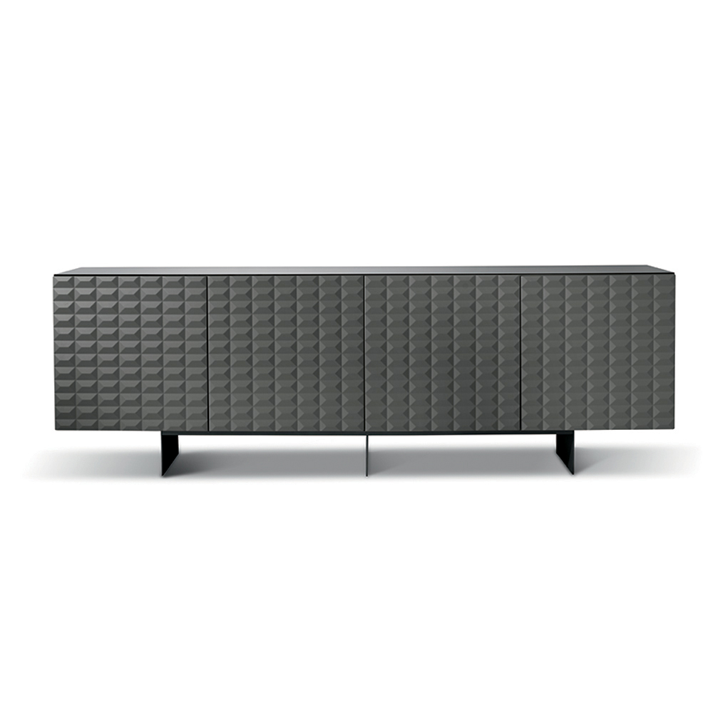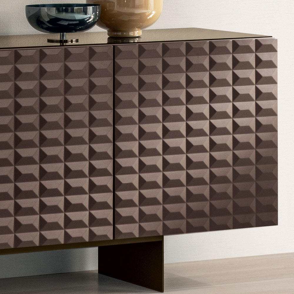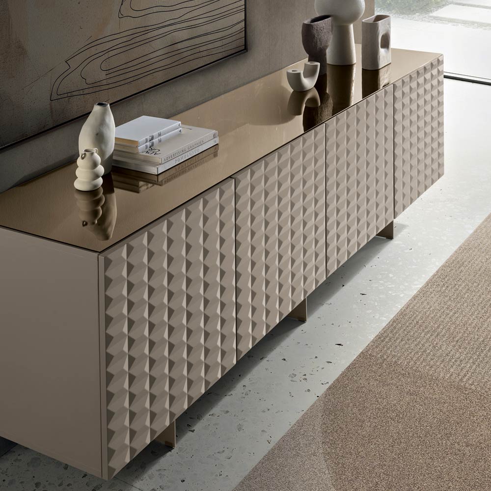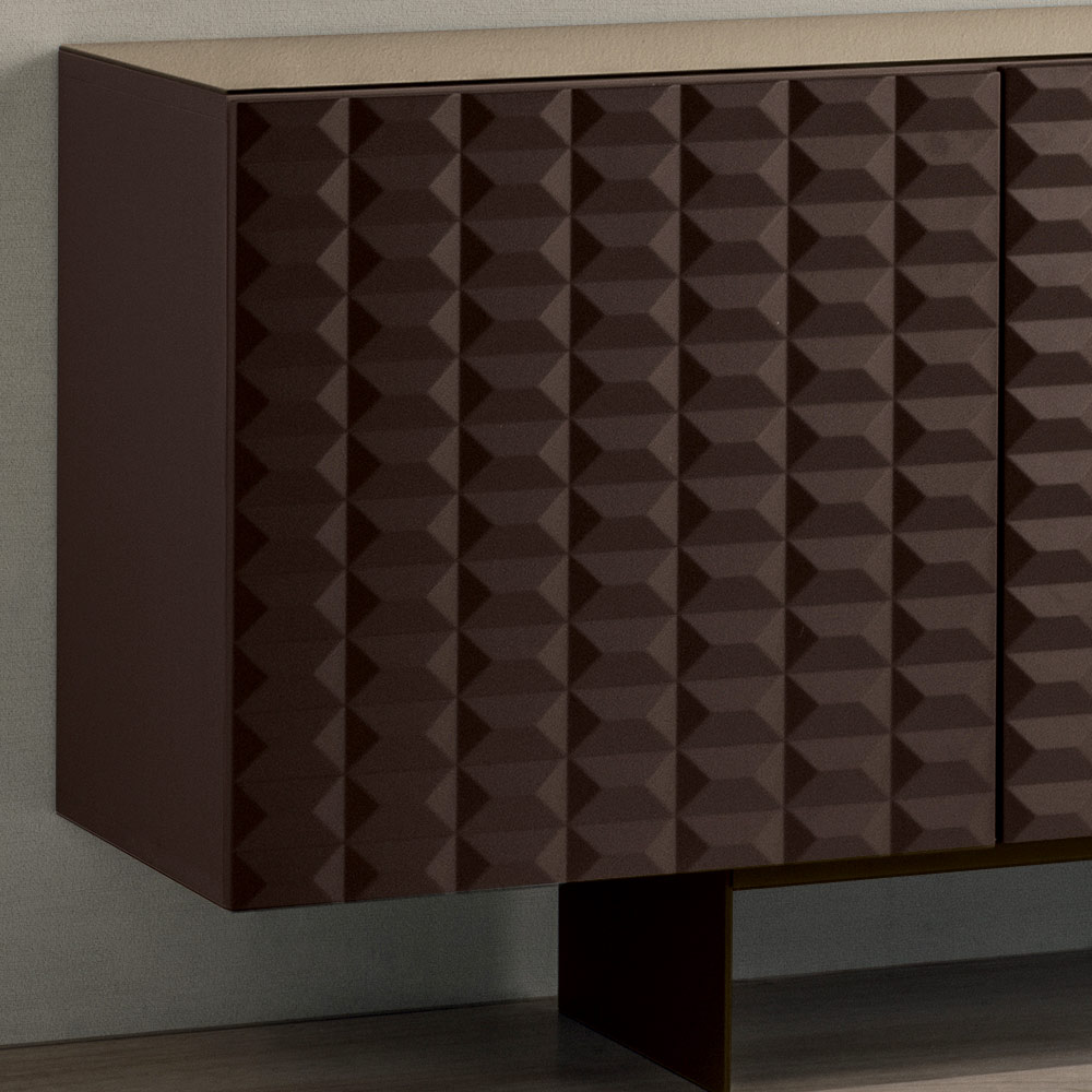 Las puertas de MDF revestidas de PVC presentan una textura geométrica tridimensional que recuerda a los famosos relieves de rombos , creando un fascinante juego de luces y sombras. Este detalle añade profundidad visual y convierte al aparador en el centro de atención de la habitación.