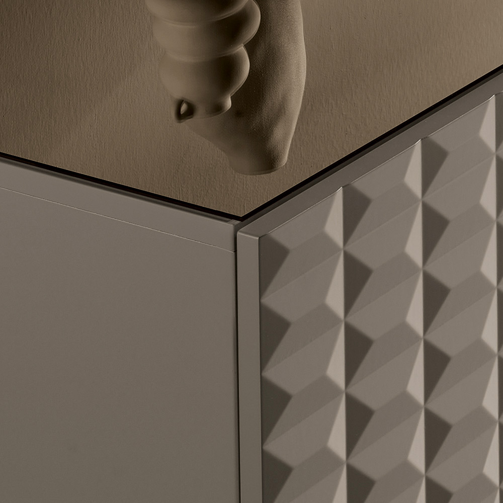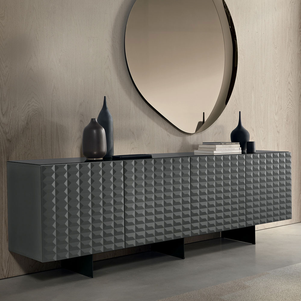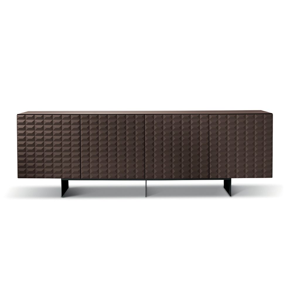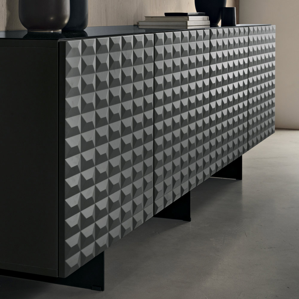 Las puertas de MDF revestidas de PVC presentan una textura geométrica tridimensional que recuerda a los famosos relieves de rombos , creando un fascinante juego de luces y sombras. Este detalle añade profundidad visual y convierte al aparador en el centro de atención de la habitación.