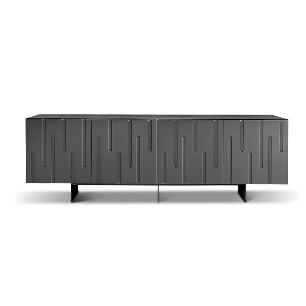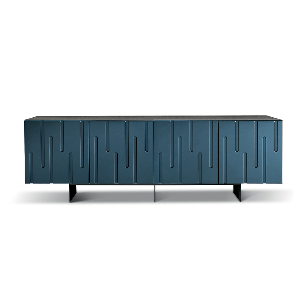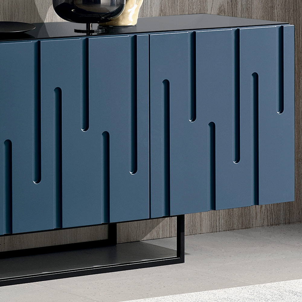 Aparador de diseño fabricado en Italia con puertas grabadas con efecto estalactita y base de metal.