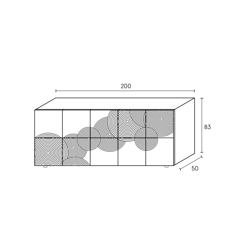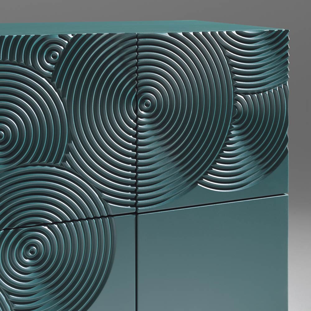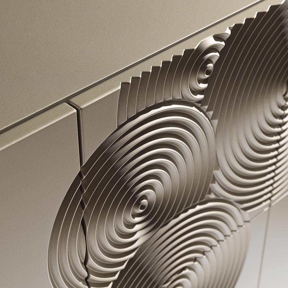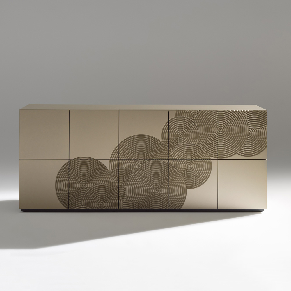 Un aparador de fuerte impacto visual, caracterizado por una refinada decoración grabada con un motivo circular y acabada totalmente a mano , capaz de crear sugerentes juegos de luces y sombras en la superficie.