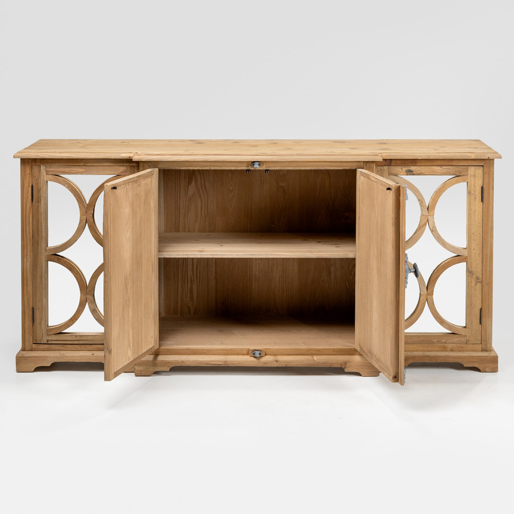 Este aparador de pino natural envejecido es un mueble impactante, con elegantes puertas de espejo que aportan luminosidad y profundidad a la estancia. El acabado envejecido realza la textura de la madera, resaltando sus vetas, nudos e irregularidades naturales.