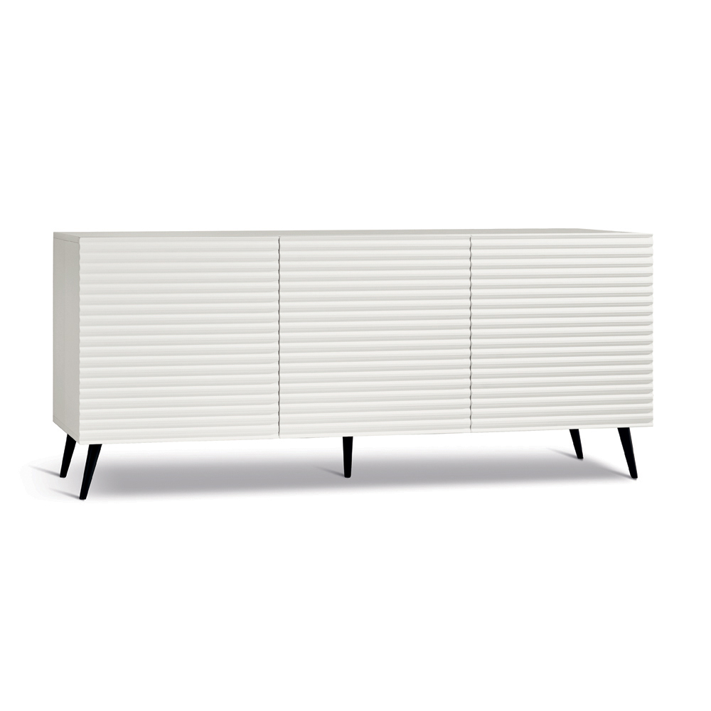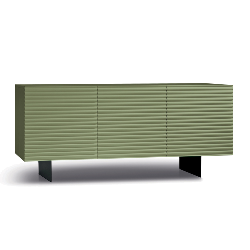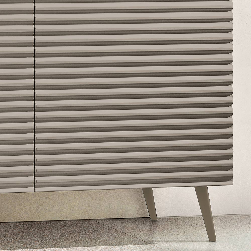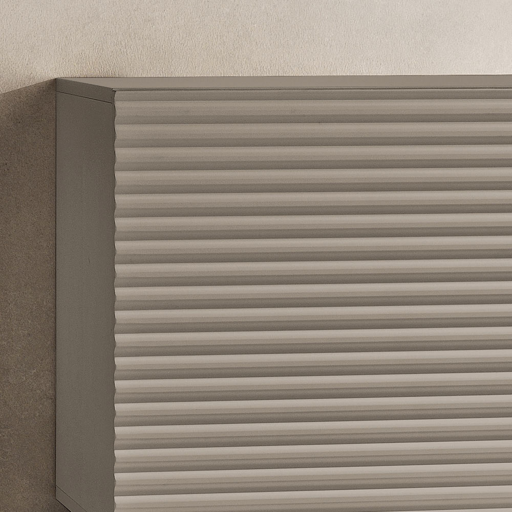 Las puertas de MDF revestidas de PVC presentan un diseño de rayas horizontales en relieve que aporta profundidad y dinamismo a la superficie, creando un elegante efecto gráfico. El cuerpo de melamina a juego completa el diseño con un refinado efecto tono sobre tono , logrando una composición armoniosa y moderna.