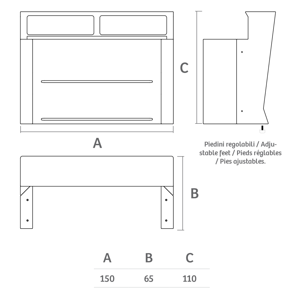 Dimensiones:- Mostrador: Alto 110 cm x Fondo: 65 cm x Largo: 150 cm