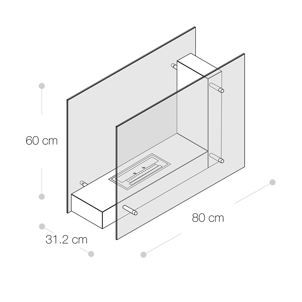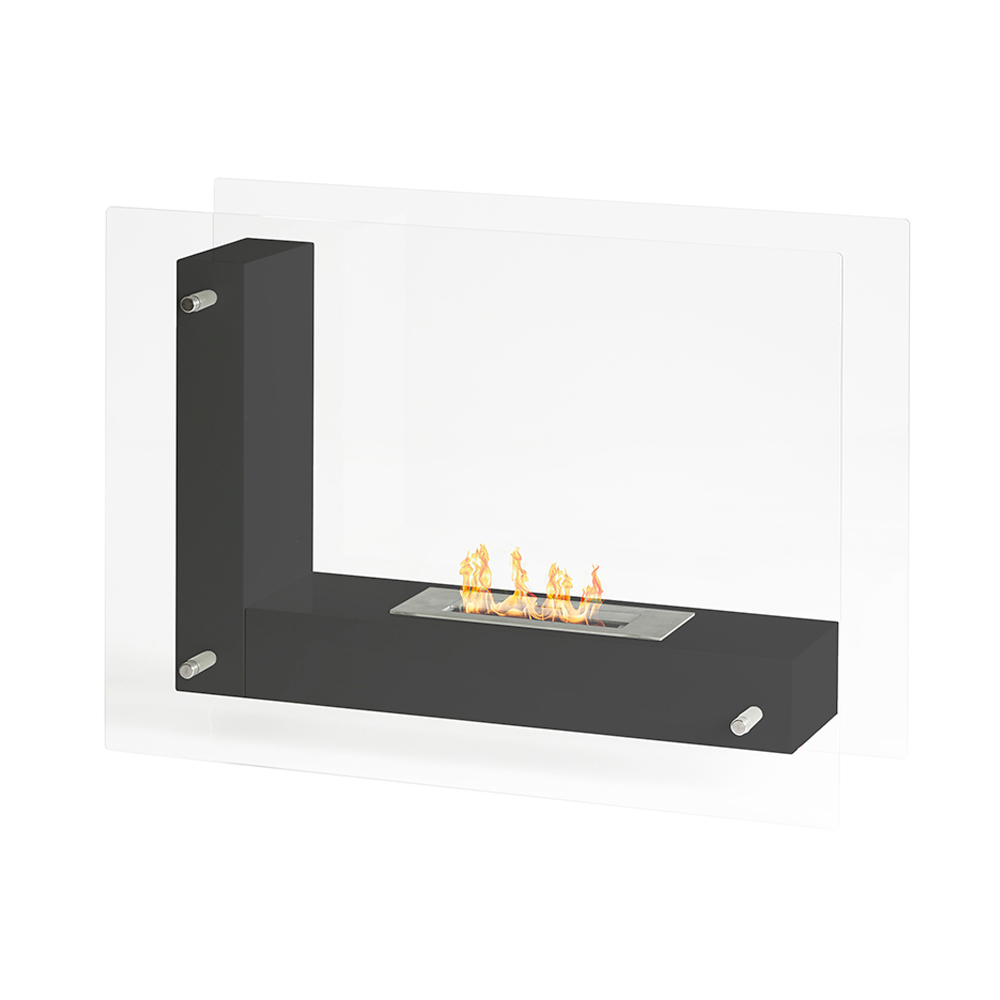 Realizada con estructura en forma de L en metal negro y cristal templado , colocado en los laterales, protege la llama de cualquier ráfaga de viento, resaltándola.