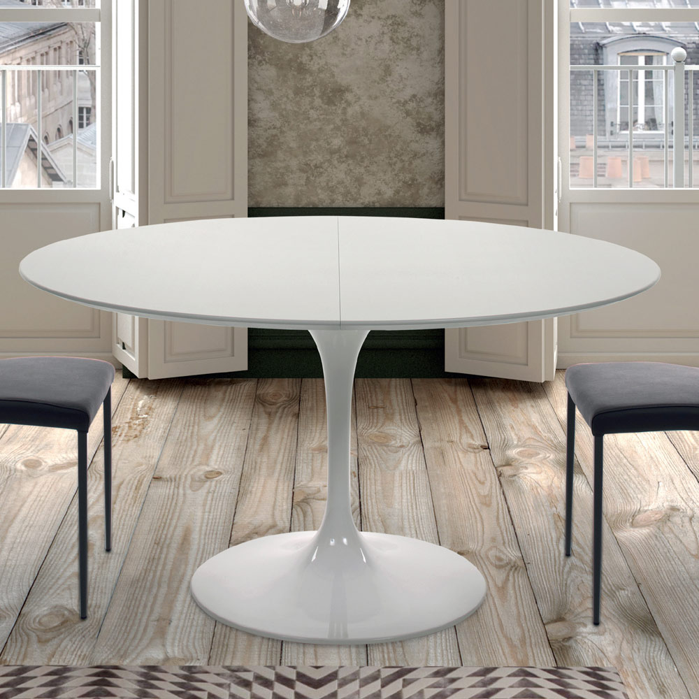 una mesa redonda. Este tipo de mesa se utiliza cada vez más para amueblar el comedor y la cocina. Esto se debe a que su forma, caracterizada por la