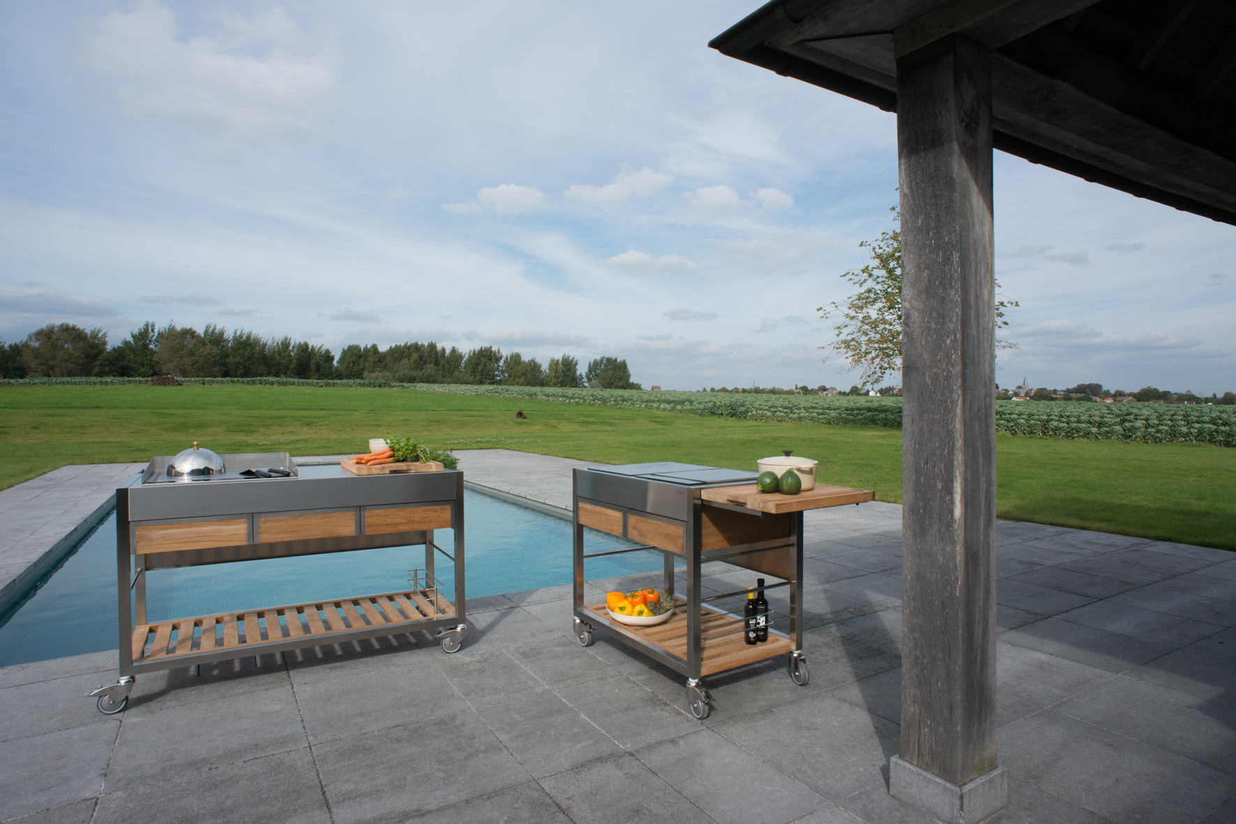 Cocinas de exterior funcionales y fácilmente transportables gracias a las ruedas, están fabricadas en madera de teca y acero inoxidable cepillado.