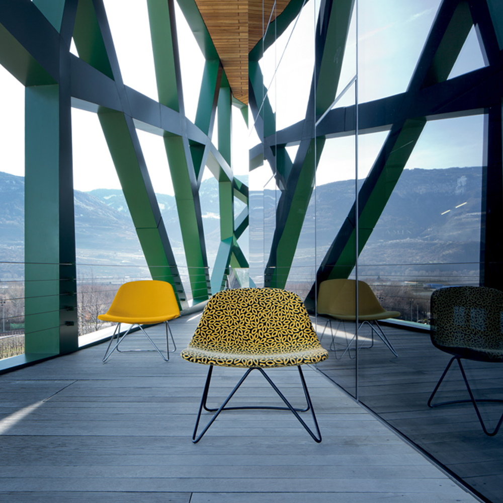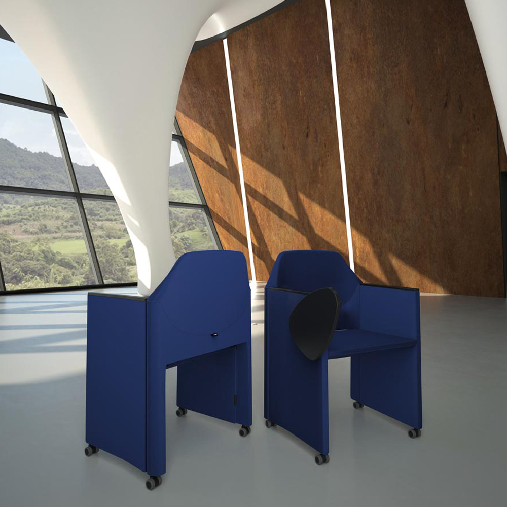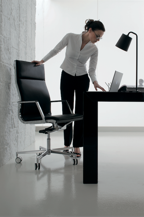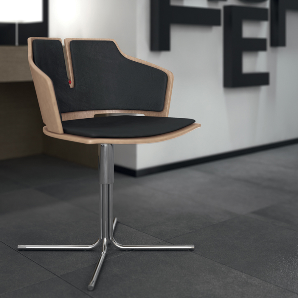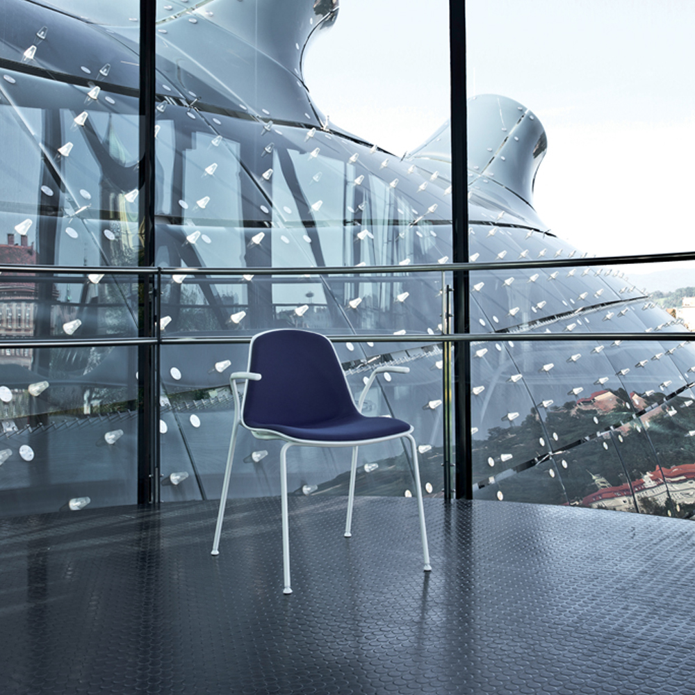 El armazón, disponible en dos alturas de respaldo, alta y media, cuenta con numerosos componentes de aluminio cromado y se apoya en bases de 4-5 vías, o en versión trineo. Tres fundas: una cómoda con gran acolchado, la segunda en malla y la tercera, la joya de la gama, con acolchado plano con ranuras sin costuras gracias al termoformado.