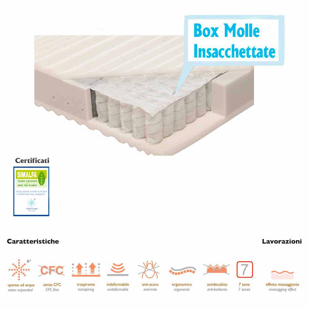 Colchón Bio Spring. Colchón de muelles ensacados, cada uno encerrado en una bolsa de algodón, que actúan independientemente unos de otros, reconfortando suavemente su cuerpo, adaptándose silenciosamente a cada movimiento y actuando independientemente de cada presión recibida sin solicitar a los demás. Los resortes están hechos de alambre de acero templado y son de diferentes espesores. Han sido diseñados para ofrecer un efecto anatómico y por tanto adaptarse mejor a las diferentes presiones que reciben, de esta manera se ayuda al cuerpo a descansar en cada punto con el apoyo adecuado. La estructura portante del colchón de muelles ensacados tiene excelentes características y hace que el colchón sea ortopédico, pero al mismo tiempo anatómico con excelentes beneficios para la columna y la circulación. Características Caja interna h14 cm con 400 resortes para la versión simple, versión doble 800 resortes. Largueros de cierre h14 cm en Espuma (poliuretano expandido rígido D25 kg/m3), capa superior de 3 cm, capa inferior de 3 cm, conformadas en ondas diferenciadas de Espuma (poliuretano expandido elástico D25 kg/m3). Expandido con agua libre de CFC Respirable Indeformable Antiácaros Ergonómico Antiescaras. Altura de la losa terminada: 22 cm, incluido el revestimiento. Peso soportado 50/100 kg. El revestimiento Paris de tejido de polialgodón de 200 g/m2 con cremallera transpirable es completamente desenfundable y lavable.