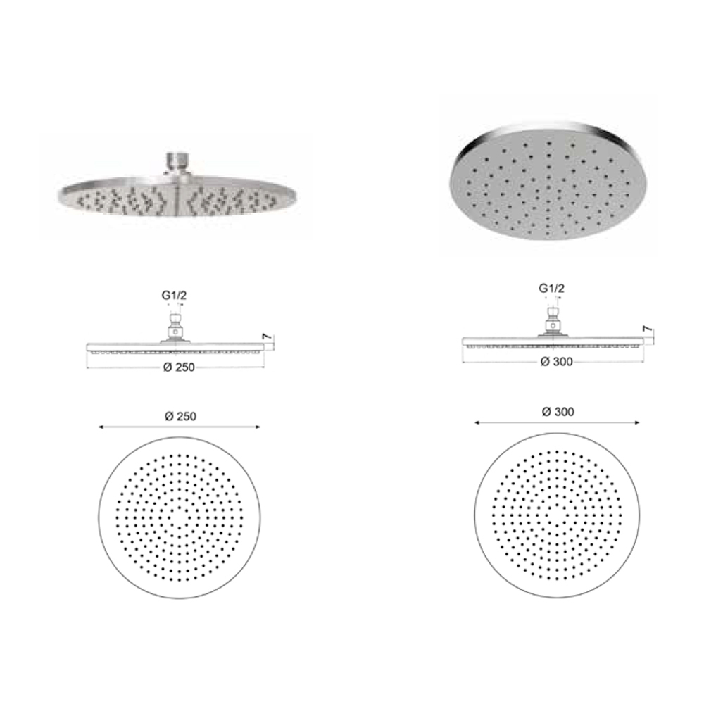 • Cabezal de ducha: diámetro 30 cm x altura 7 cm - brazo 35 cm