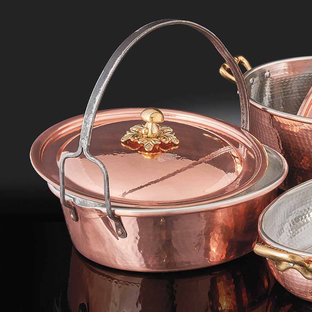La cazuela de cobre macizo martillado a mano con tapa y práctico asa arqueada es ideal para cocinar risotto, conejo estilo Ischia, pollo, carnes estofadas y, en general, es adecuada para cocinar a fuego lento.