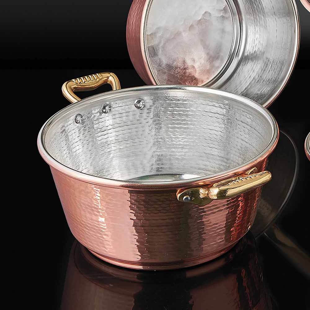 Cacerola de cobre martillado a mano con forma cónica con tapa, fabricada en Italia.