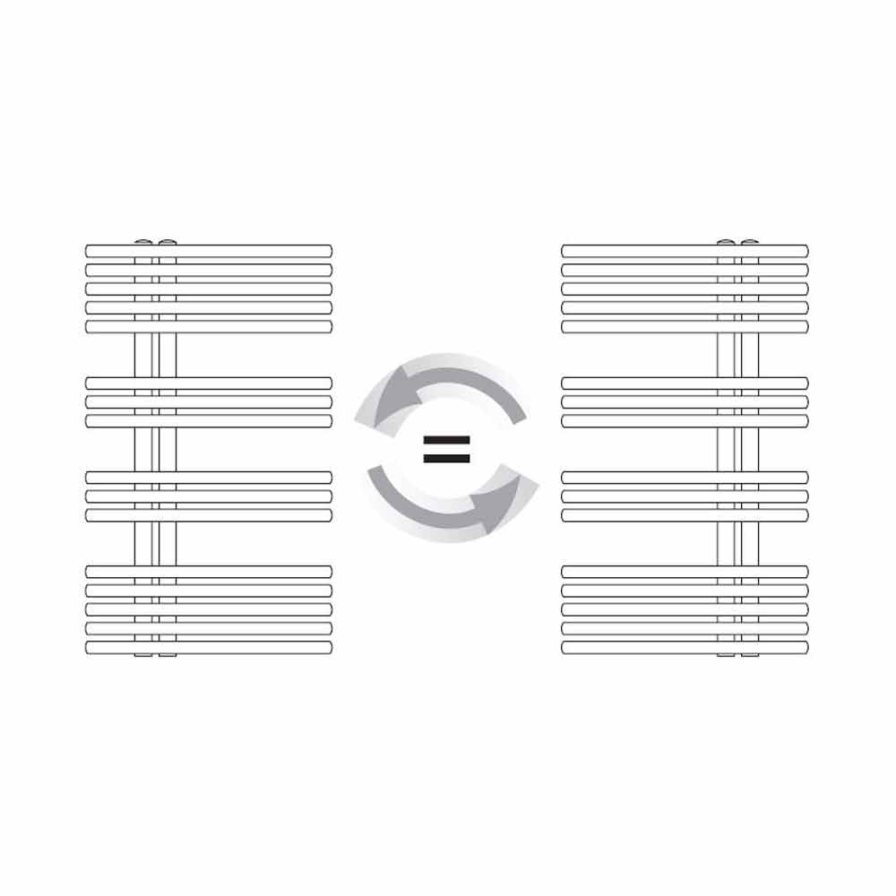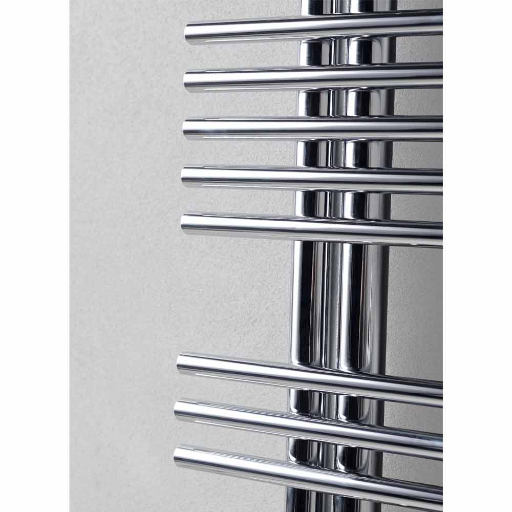 radiador calentador de toallas presenta un diseño cromado hecho con tubos verticales de 35 mm de diámetro y tubos redondos horizontales de 25 mm de diámetro. Su forma moderna y particular la hace