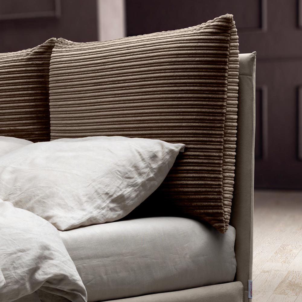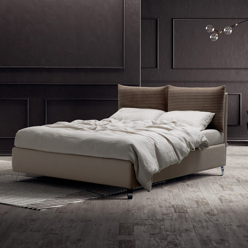 Cama de matrimonio con base dinámica , cajón contenedor,pies de metal con acabado en acero pulido (altura 12 cm) y cabecero realizado con dos suaves cojines en tejido ecológico y ecológico, en contraste con la cama en tejido repelente al agua. Los cojines se fijan a la estructura con prácticos insertos adhesivos de velcro que permiten una extracción cómoda y sencilla. Esta cama es el epítome de la comodidad y el diseño contemporáneo. Es una combinación perfecta de refinamiento y funcionalidad , diseñada para ofrecer noches de puro relax y un estilo inigualable.