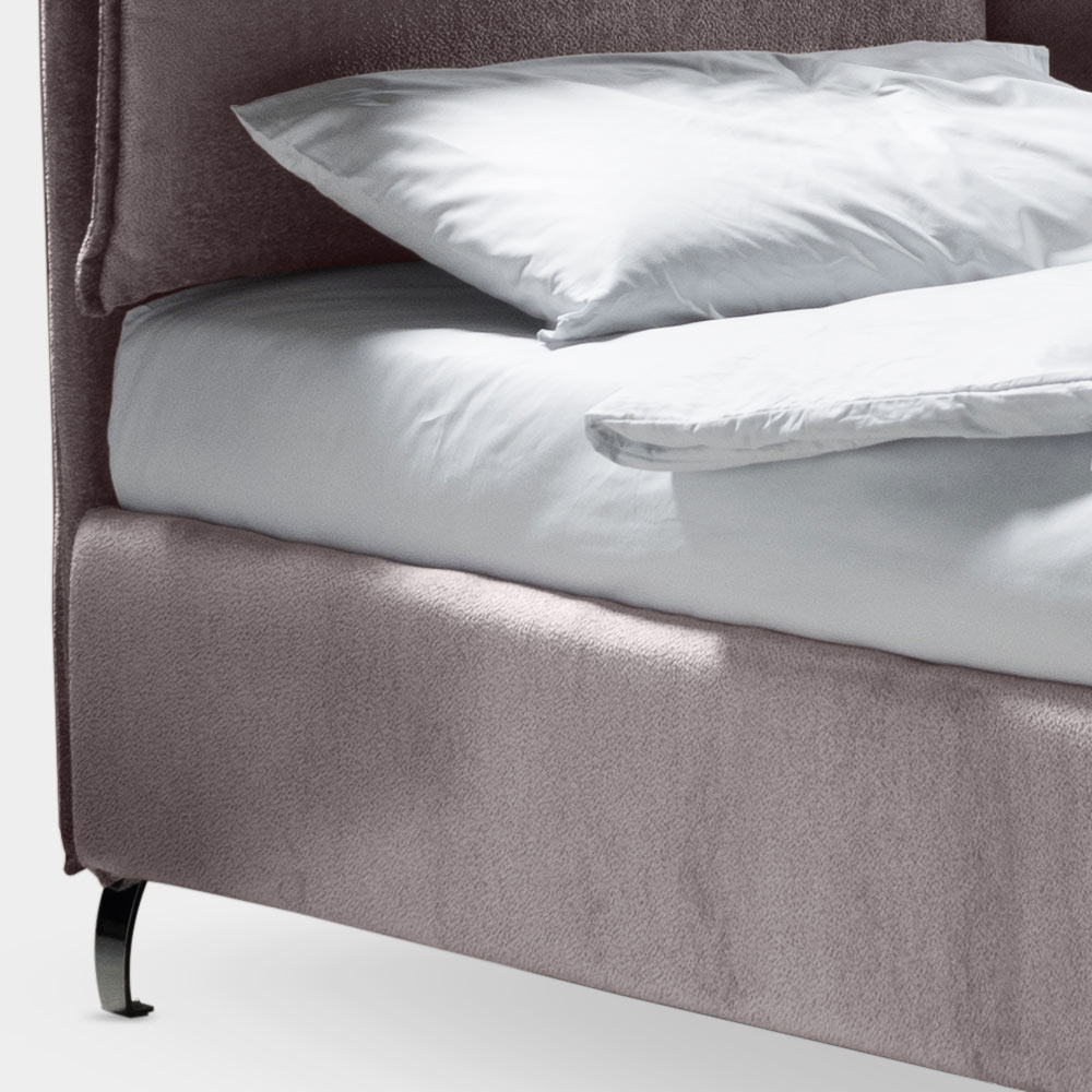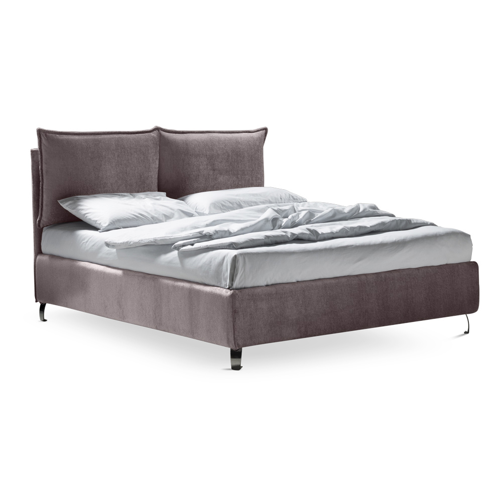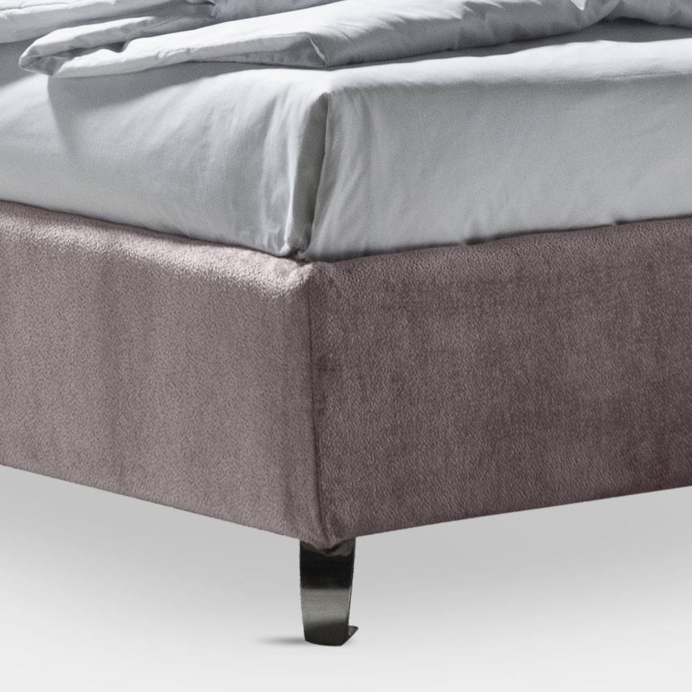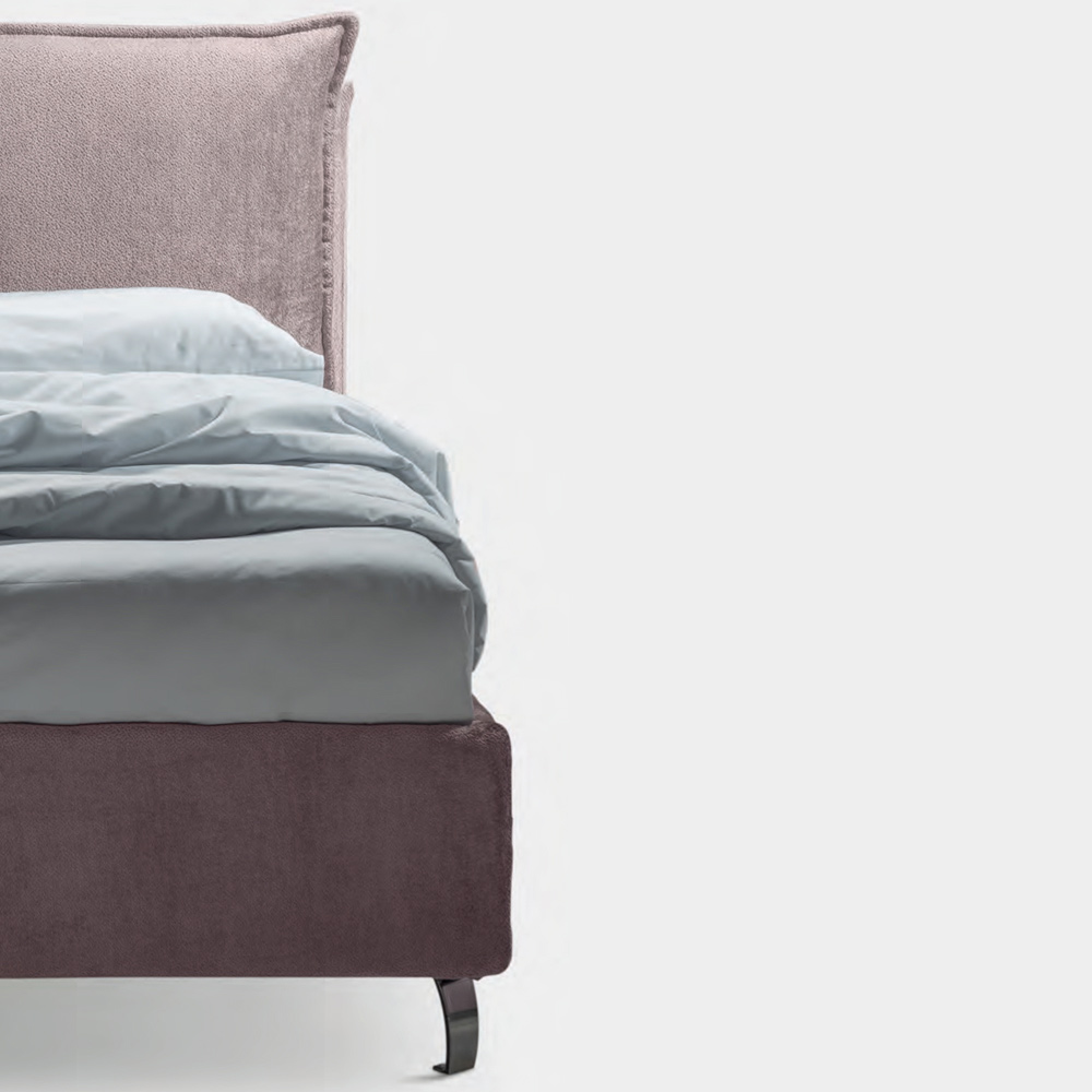 Cama de matrimonio con base dinámica , arcón contenedor,pies de metal con acabado acero pulido (altura 12 cm) y cabecero en tejido ignífugo, está realizada con dos suaves cojines con volante perimetral fijados con prácticas inserciones de velcro adhesivo que permiten una cómoda y fácil extracción. Esta cama es el epítome de la comodidad y el diseño contemporáneo. Es una combinación perfecta de refinamiento y funcionalidad , diseñada para ofrecer noches de puro relax y un estilo inigualable.