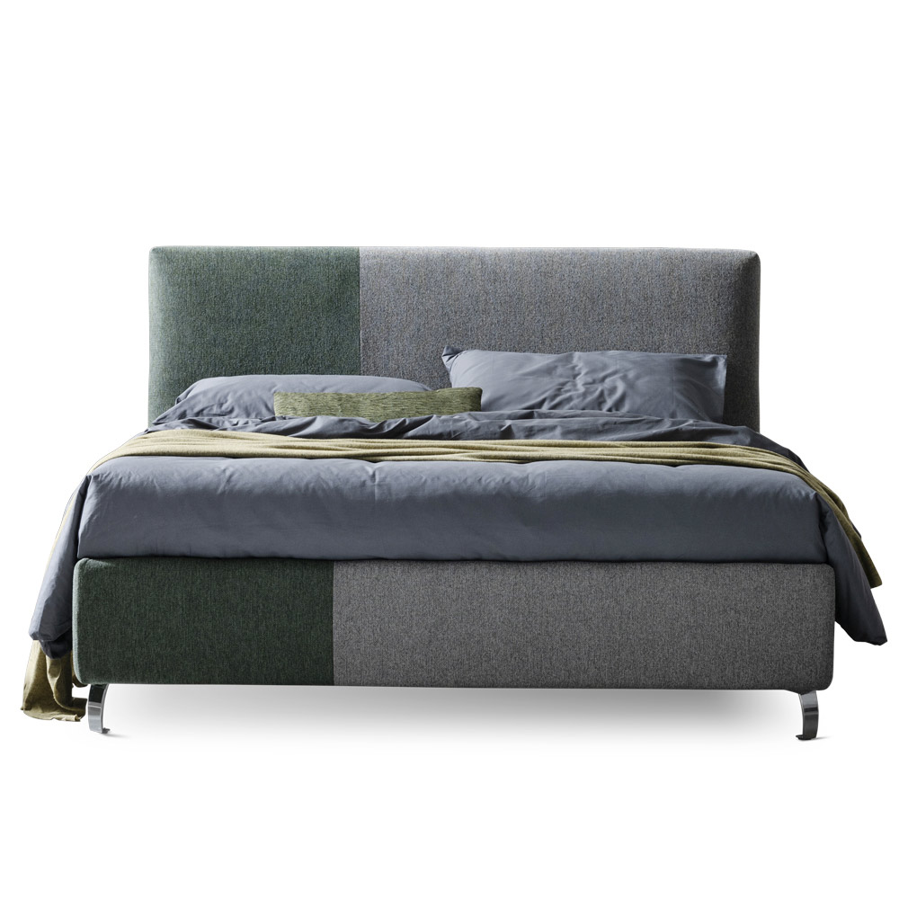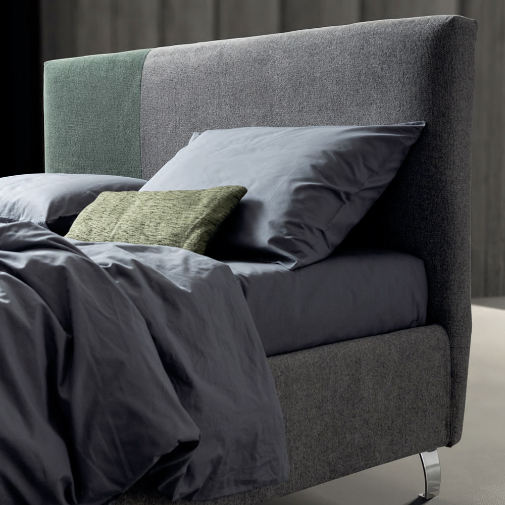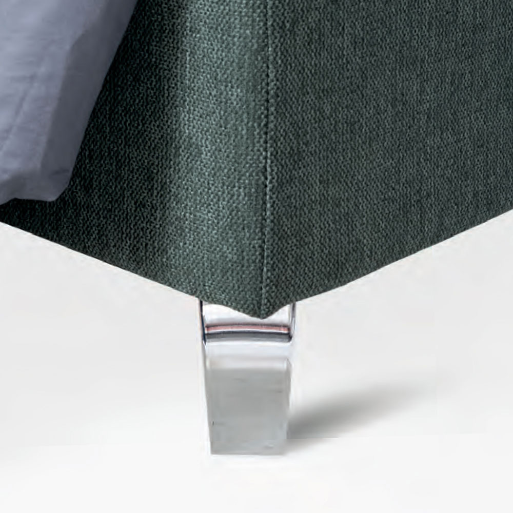 Cama de matrimonio revestida en tejido bicolor hidrófugo y antimanchas con base dinámica , arcón contenedor y pies de metal acabado acero pulido (altura 12 cm).