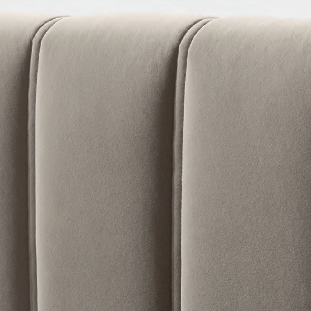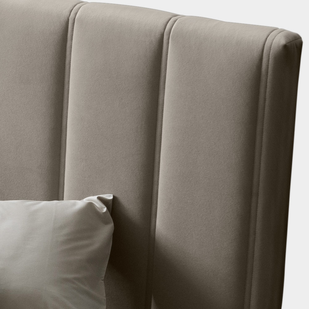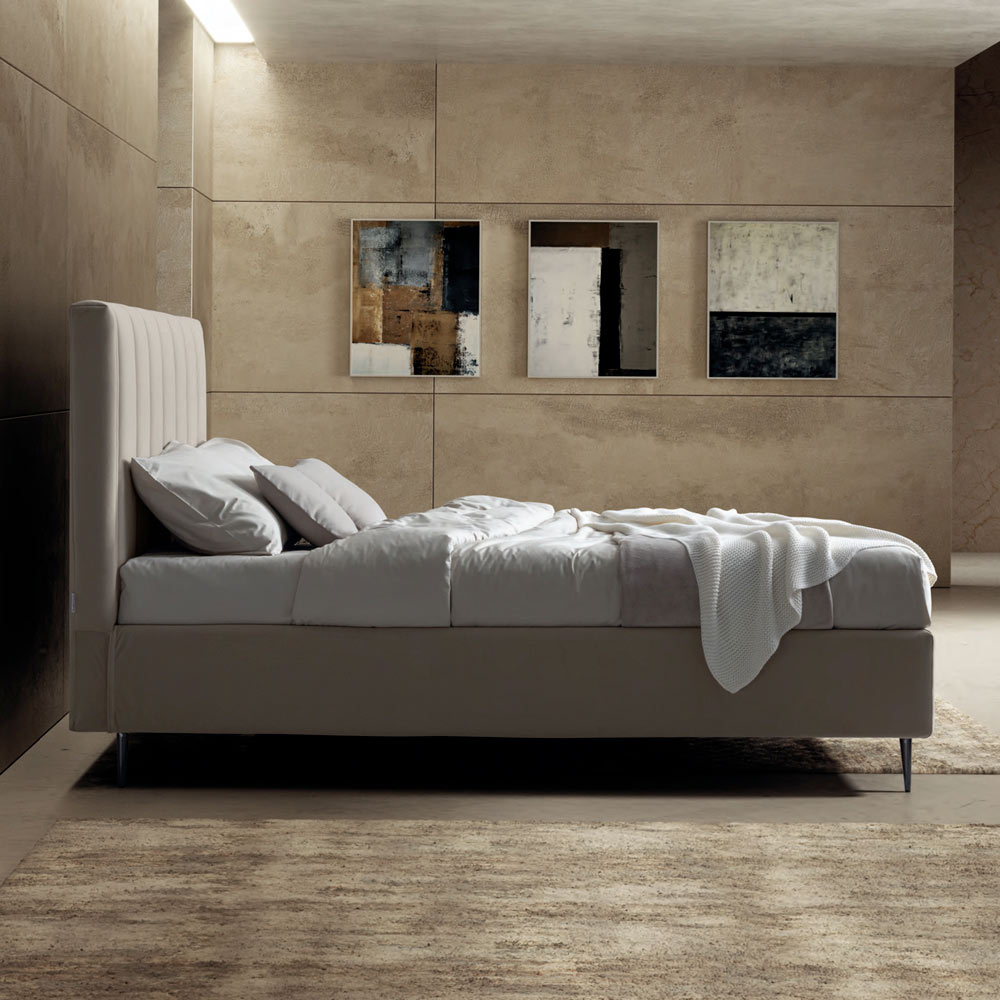 Cama de matrimonio con base dinámica , arcón contenedor, pies de metal acabado moka (altura 15 cm) y grueso cabecero en tejido ignífugo, realizado con un particular proceso de acolchado con anchas bandas verticales que resalta el rigor y la limpieza de las líneas. Esta cama es el epítome de la comodidad y el diseño contemporáneo. Es una combinación perfecta de refinamiento y funcionalidad , diseñada para ofrecer noches de puro relax y un estilo inigualable.