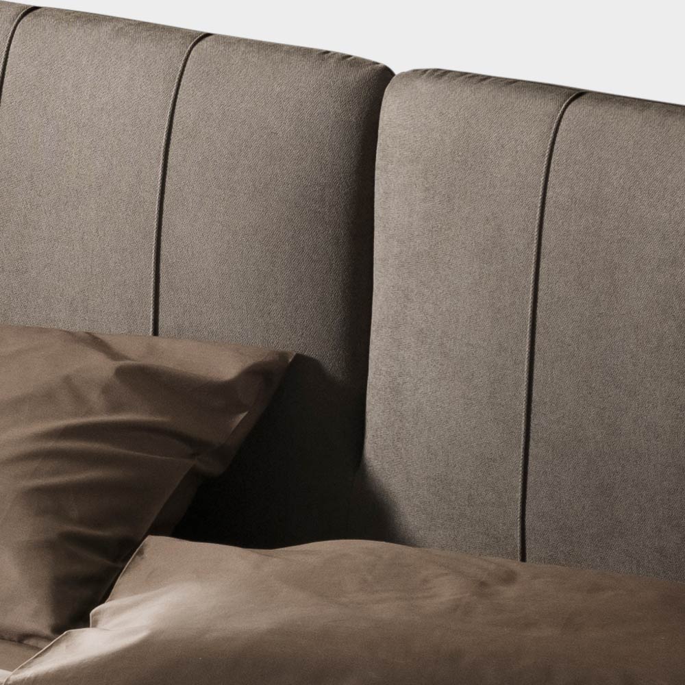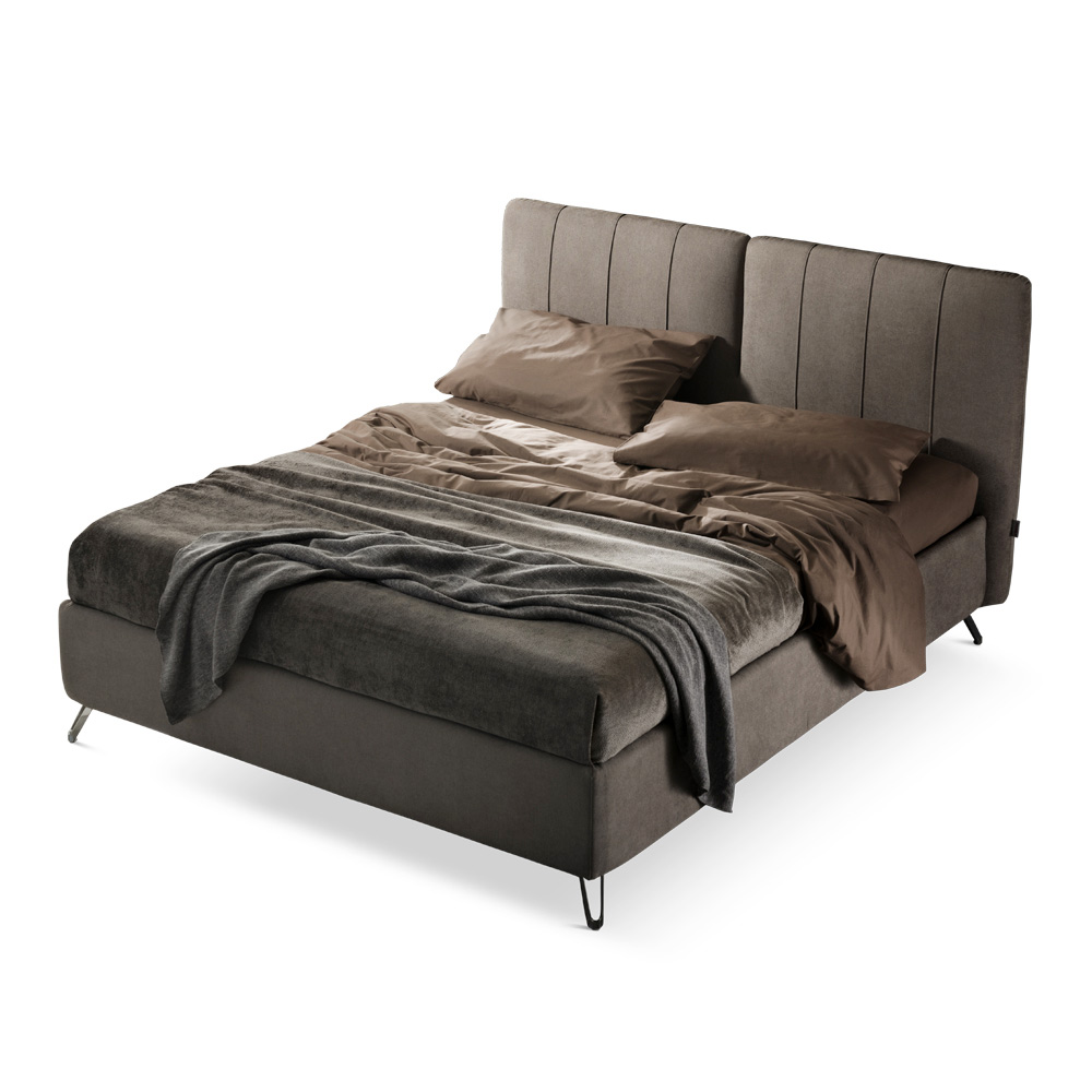 Cama de matrimonio con base dinámica , arcón contenedor,pies de metal con acabado acero pulido (altura 12,3 cm) y cabecero obtenido gracias a un acolchado especial, realizado con perfiles verticales cordonados, que le confieren un original efecto estético en tejido hidrófugo y antimanchas. Esta cama es el epítome de la comodidad y el diseño contemporáneo. Es una combinación perfecta de refinamiento y funcionalidad , diseñada para ofrecer noches de puro relax y un estilo inigualable.