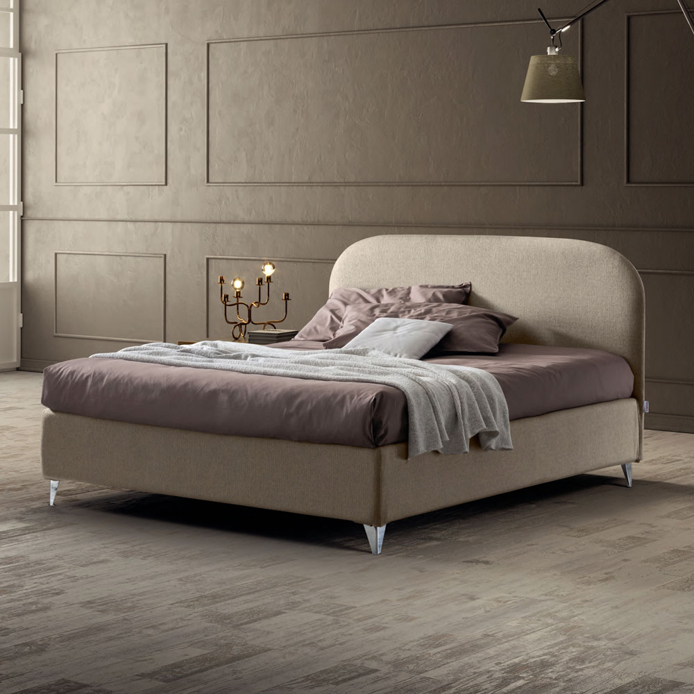 Cama de matrimonio revestida en tejido ignífugo con malla dinámica , arcón de almacenaje y pies de metal con acabado acero pulido (altura 12 cm). Esta cama es el epítome de la comodidad y el diseño contemporáneo. Es una combinación perfecta de refinamiento y funcionalidad , diseñada para ofrecer noches de puro relax y un estilo inigualable.