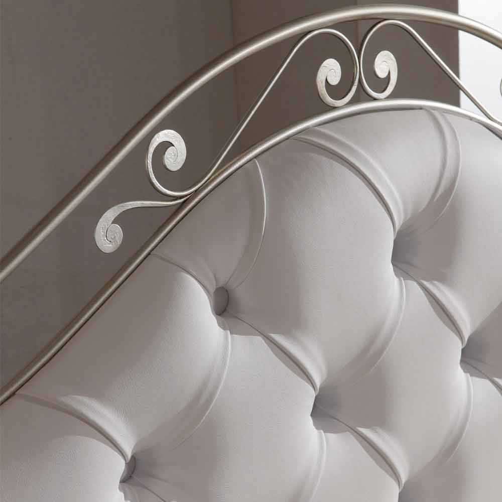 Gracie está enriquecida con una cabecera acolchada de capitonné, cubierta con piel sintética en el delicado acabado blanco que se une a la delicadeza de la estructura plateada.