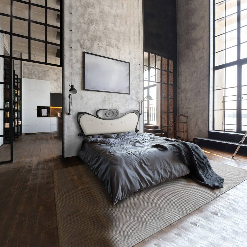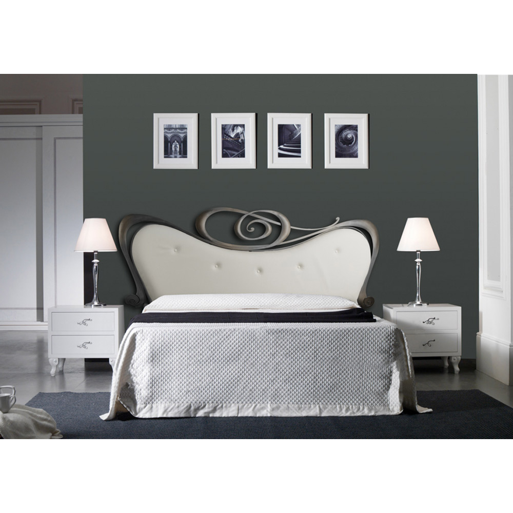 Cama doble realizada con cabecero y estructura de cama en 90% hierro macizo y 10% hierro tubular con acolchado de piel auténtica blanco nieve y acabado con recubrimiento en polvo. Cama con perfiles suaves y curvos que aportan efecto visual y luminosidad a la estancia. Este producto puede integrarse en cualquier estilo de decoración, respondiendo a diferentes necesidades de diseño, funcionalidad y calidad.