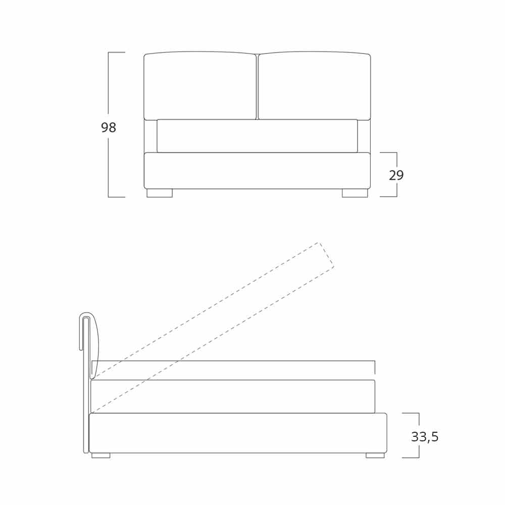 Cama doble con cajón de almacenaje fabricada en Italia Iorca by Bolzan La cama de matrimonio Iorca presenta un diseño sencillo y moderno. El elemento que caracteriza a esta cama son los cojines del cabecero, que permiten recrear un espacio en el dormitorio pensado para disfrutar de agradables momentos de relax. Las líneas suaves y sencillas crean un ambiente íntimo y acogedor. Es totalmente desenfundable. Estructura en listones de madera de abeto con acabado interior natural h.29 cm, recubiertos de espuma de poliuretano sin clorofluorocarbonos según las normas UNI y revestidos con velfodera estable a la luz. Los fondos de la estructura son de aglomerado de madera con acabado interior sintético con efecto abeto, estos últimos están soportados por perfiles de PE y tubulares. Somier de láminas con estructura de metal, marco curvado con perfil de 50x37 mm pintado con polvos epoxídicos. Somier de láminas ortopédico normal, láminas curvadas de madera contrachapada de haya. Sistema de pies H 4,5 centímetros