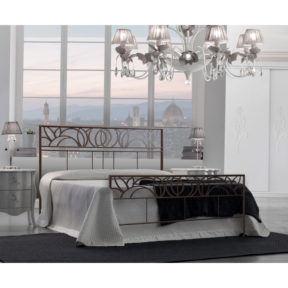 Cama de matrimonio realizada con cabecero y pie de cama a juego en hierro macizo y acabado con pintura en polvo corten. Producto de estilo clásico con acabados modernos en la estructura que crean una cama única y original que satisface las necesidades de gusto y estilo de todos aquellos que quieren darle un toque inolvidable a la zona de dormitorio.