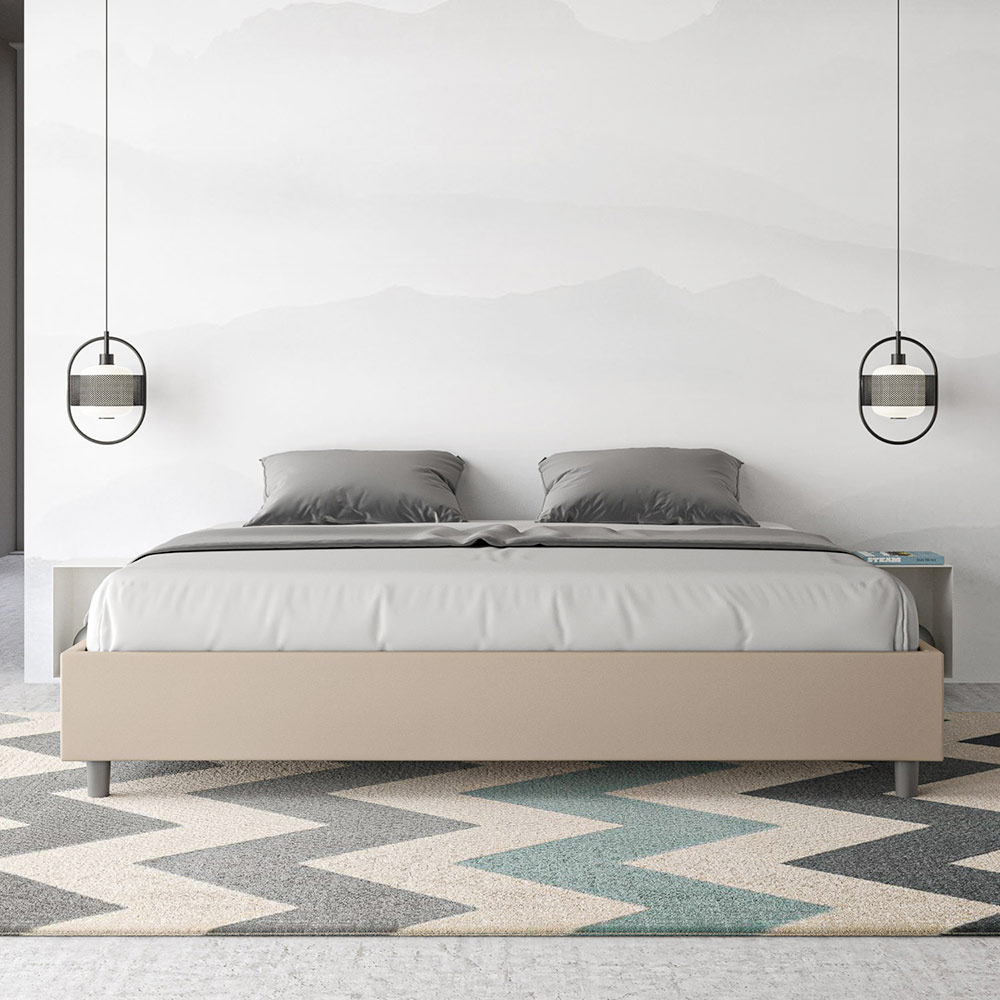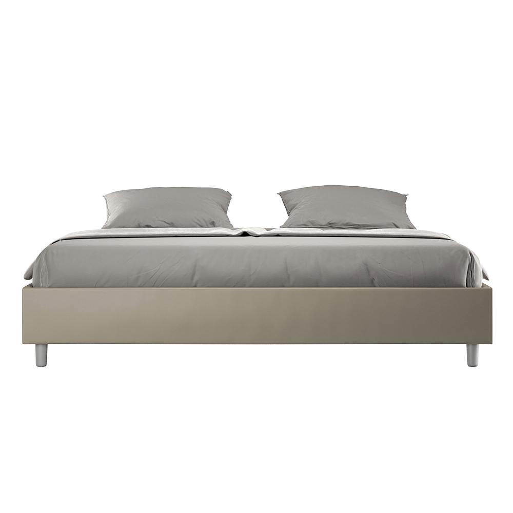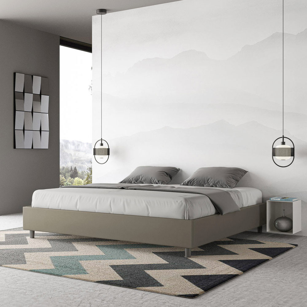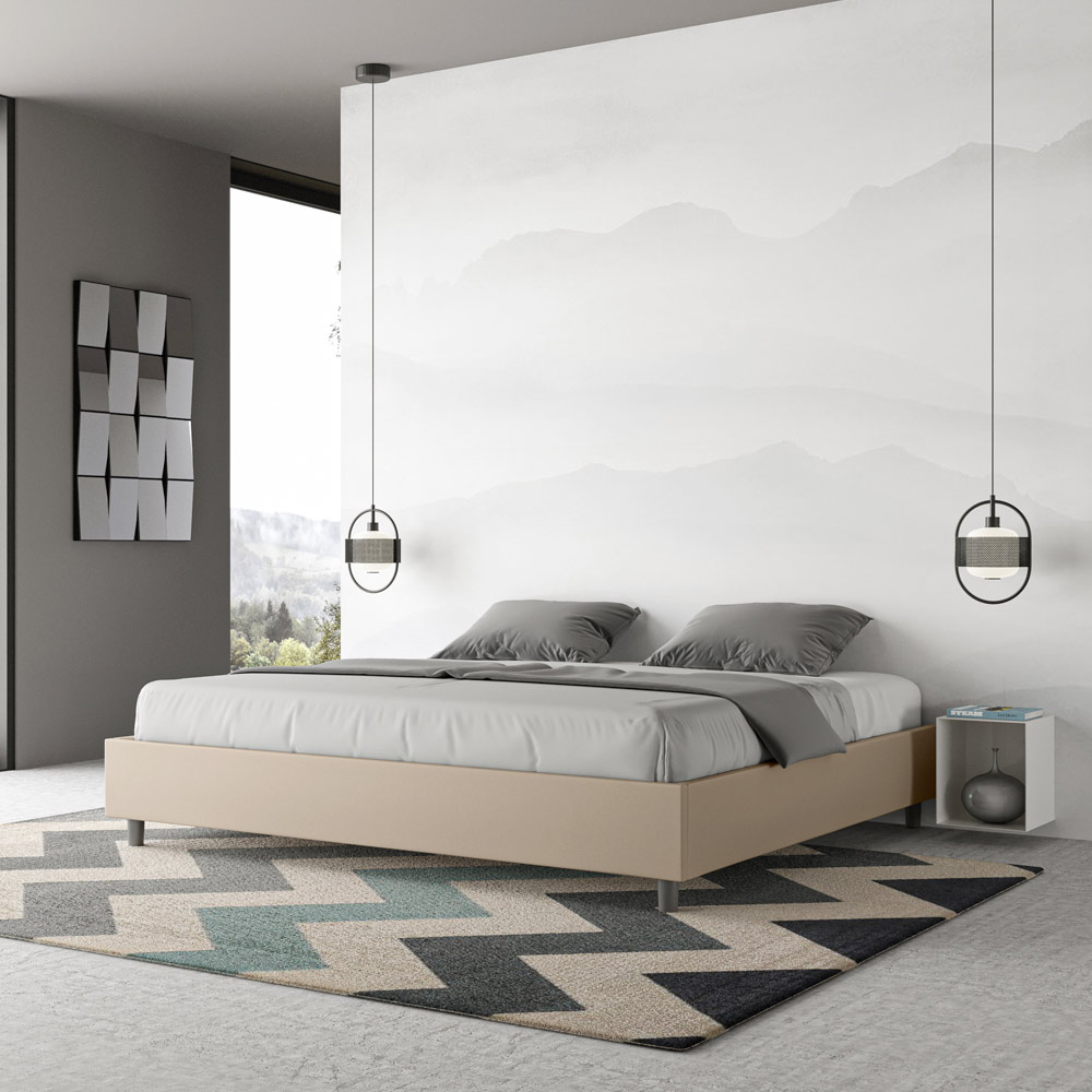 Cama king size de 180x200 cm, acolchada, fabricada con paneles de melamina y revestida en piel sintética , totalmente Made in Italy. Esta cama king size destaca por su diseño limpio y minimalista . Su estética discreta y su versatilidad facilitan su integración en cualquier ambiente. Una de sus características distintivas es la ausencia de un cabecero tradicional , lo que la hace ideal para colocarla en espacios singulares, como debajo de una ventana, en un ático o cerca de una pared decorativa, sin obstruir la vista ni lograr el efecto deseado.