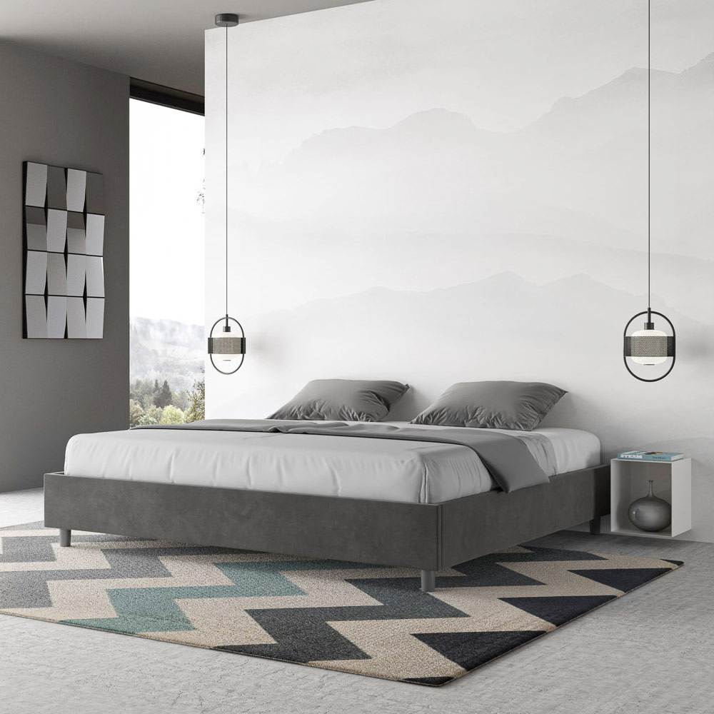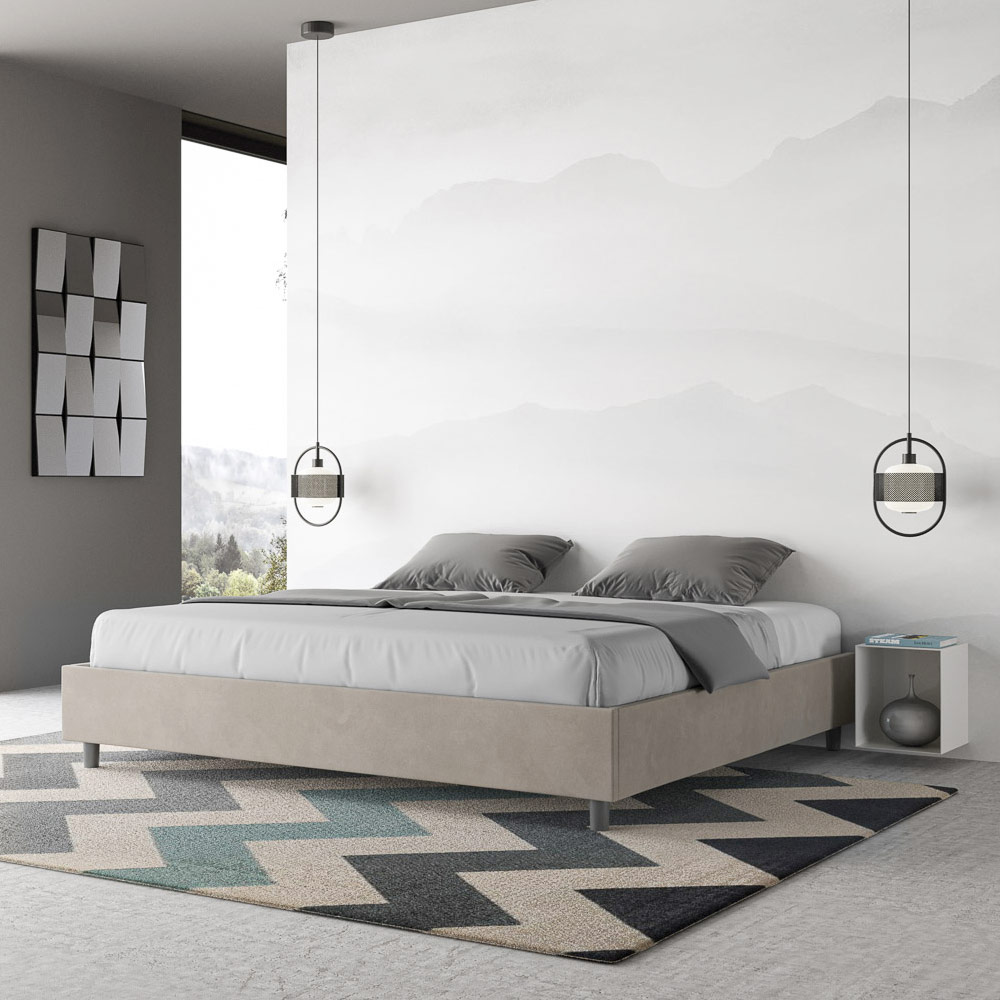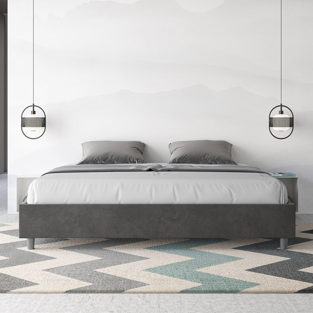 Cama king size de 190x200 cm, acolchada, fabricada con paneles de melamina y revestida de microfibra , totalmente Made in Italy. Esta cama king size destaca por su diseño limpio y minimalista . Su estética discreta y su versatilidad facilitan su integración en cualquier ambiente. Una de sus características distintivas es la ausencia de un cabecero tradicional , lo que la hace ideal para colocarla en espacios singulares, como debajo de una ventana, en un ático o cerca de una pared decorativa, sin obstruir la vista ni lograr el efecto deseado.