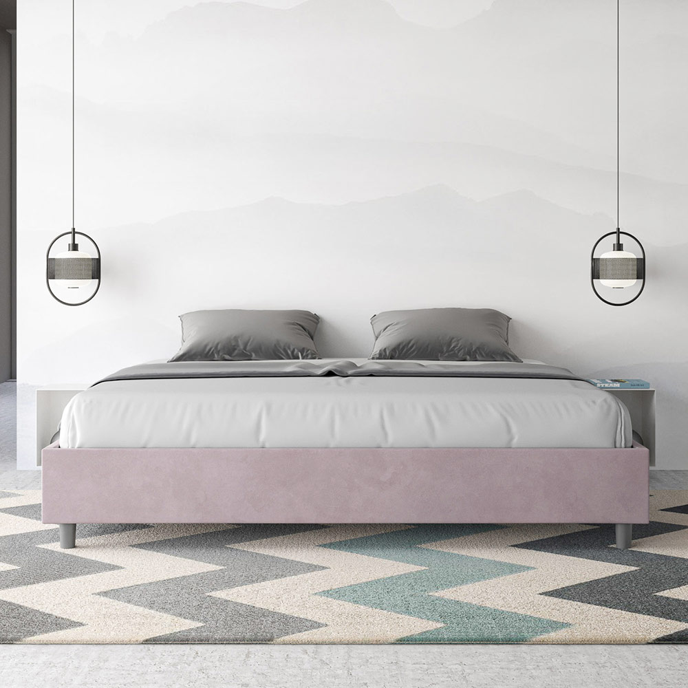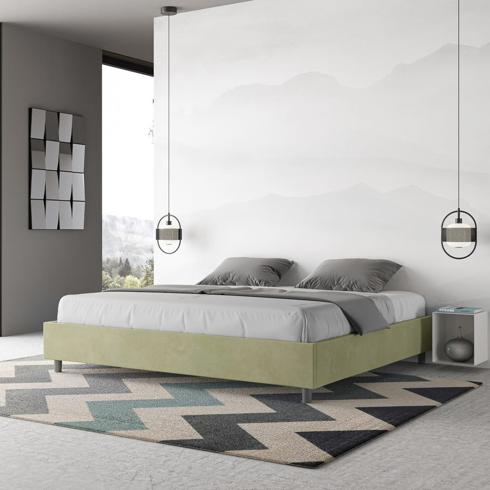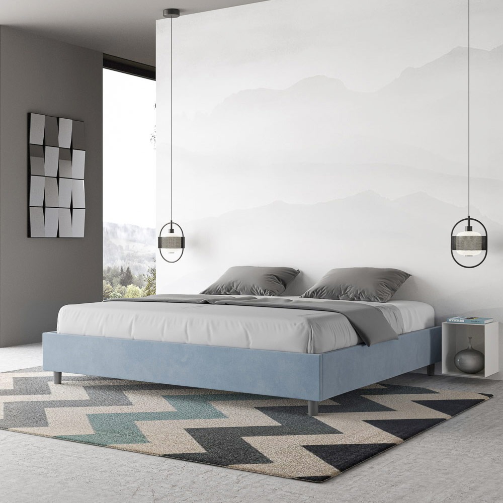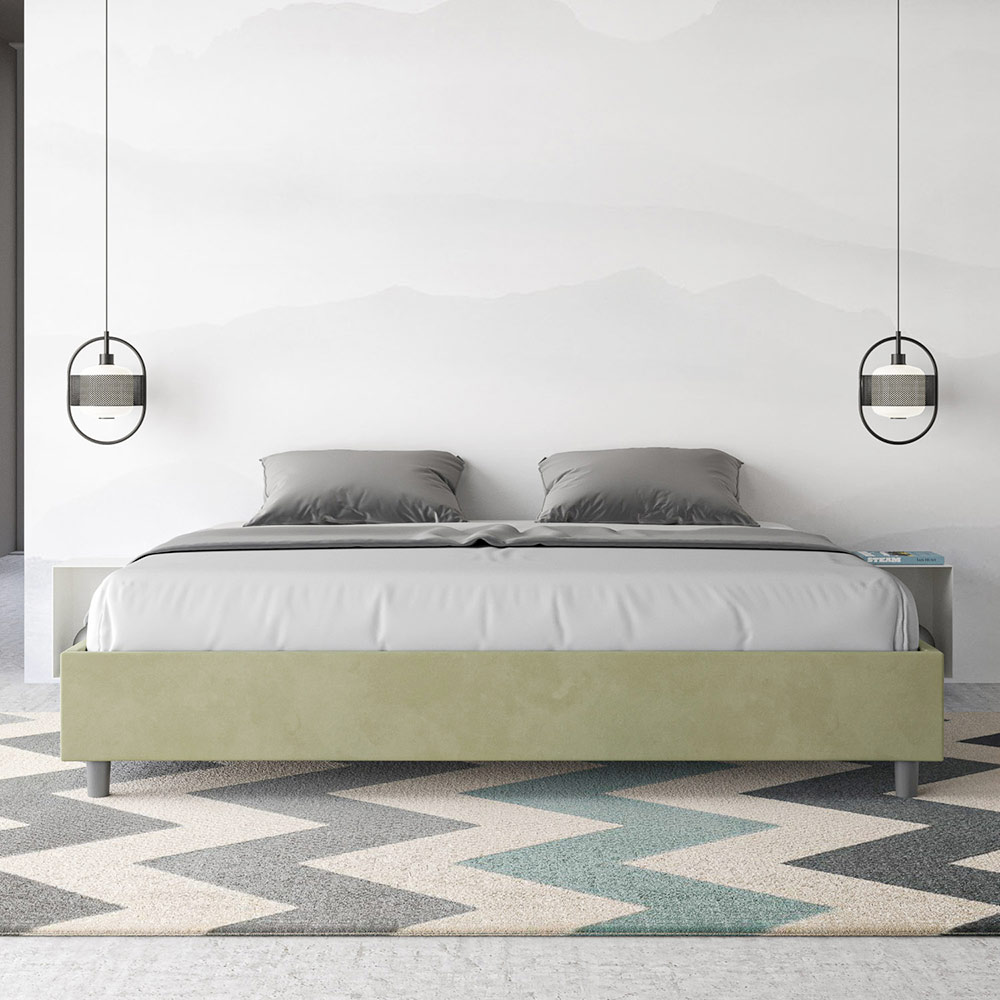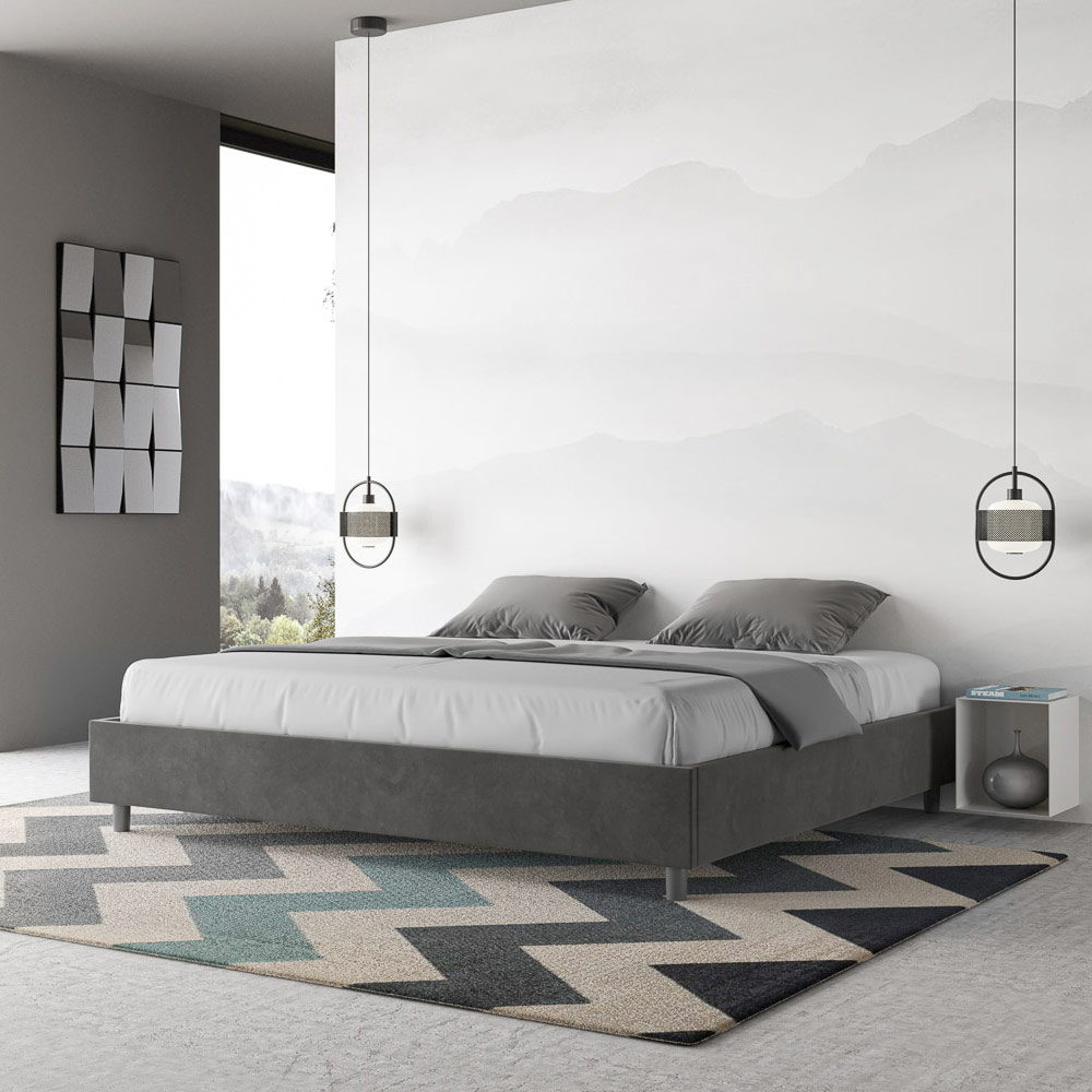 Cama super king size de 200x200 cm, acolchada y tapizada en microfibra, fabricada en Italia.