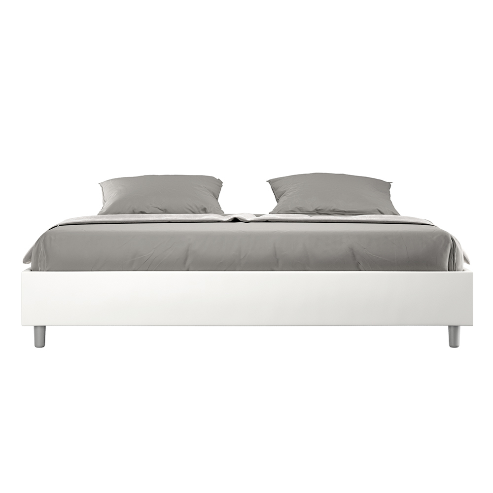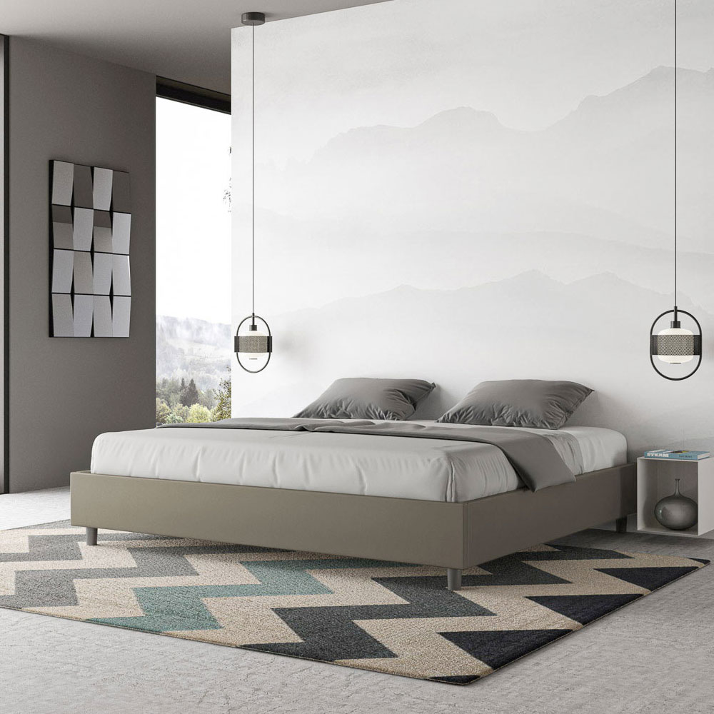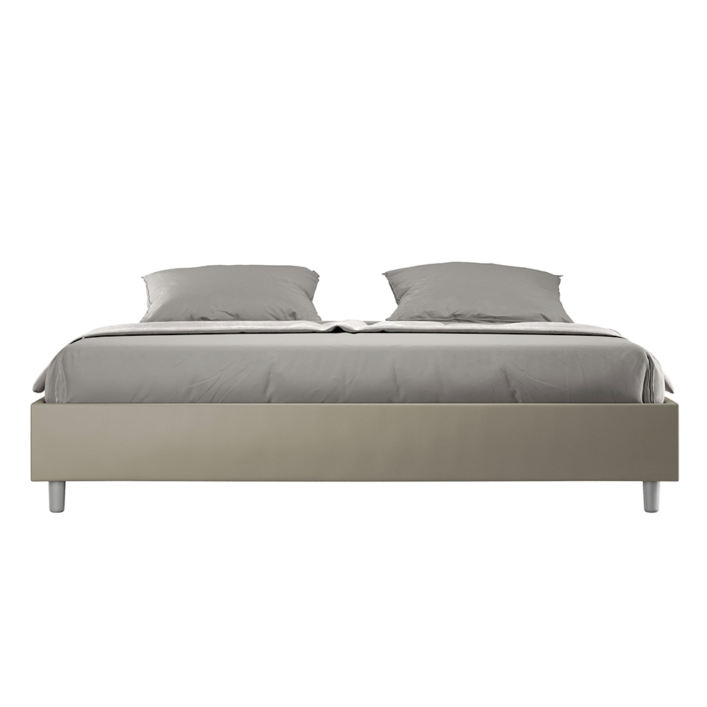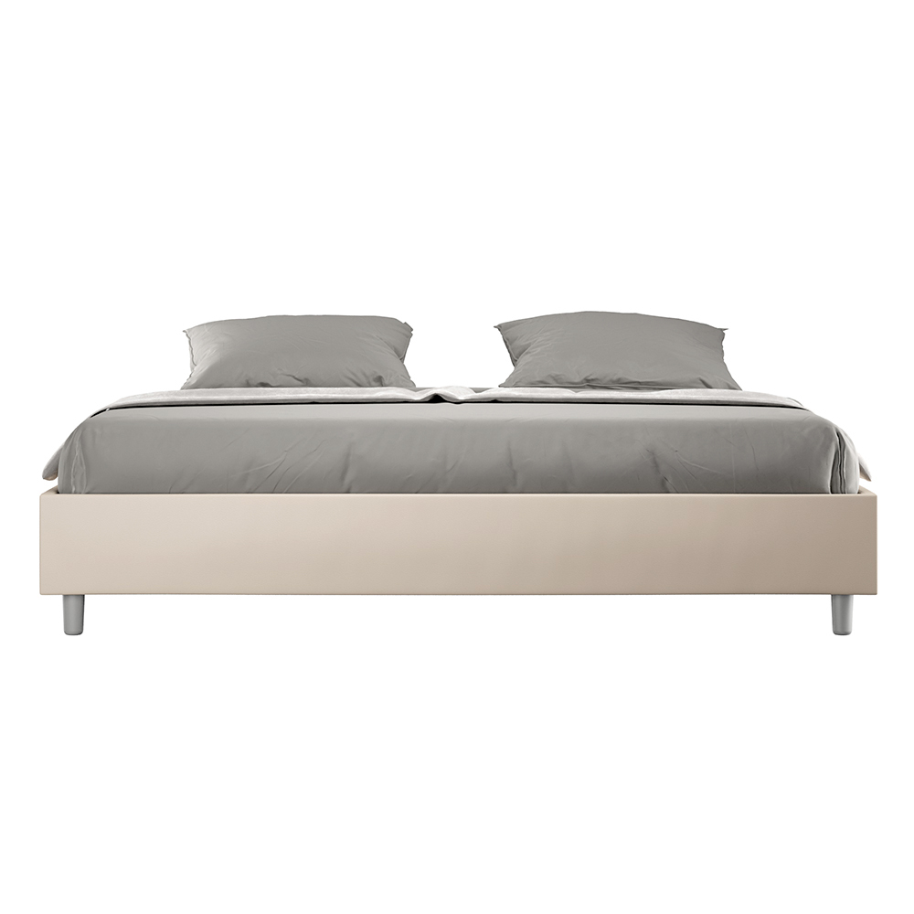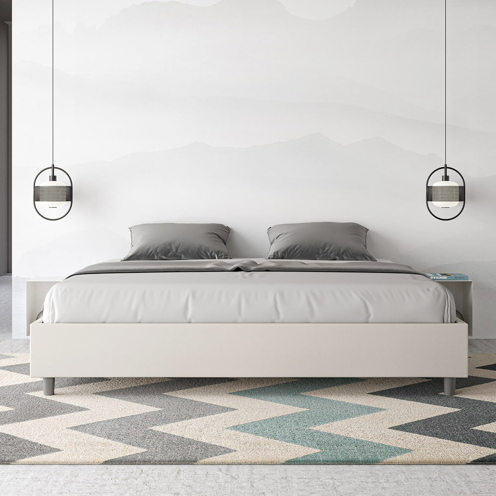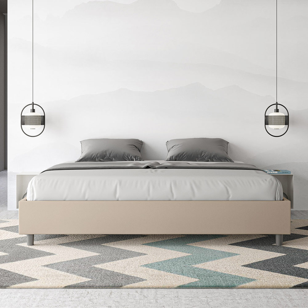 Cama super king size de 200x200 cm, acolchada, fabricada con paneles de melamina y revestida en piel sintética , totalmente Made in Italy. Esta cama extragrande destaca por su diseño limpio y minimalista . Su estética discreta y su versatilidad facilitan su integración en cualquier ambiente. Una de sus características distintivas es la ausencia de un cabecero tradicional , lo que la hace ideal para colocarla en espacios singulares, como debajo de una ventana, en un ático o cerca de una pared decorativa, sin obstruir la vista ni lograr el efecto deseado.