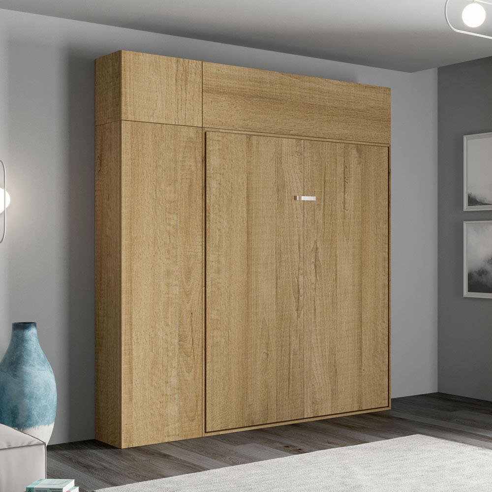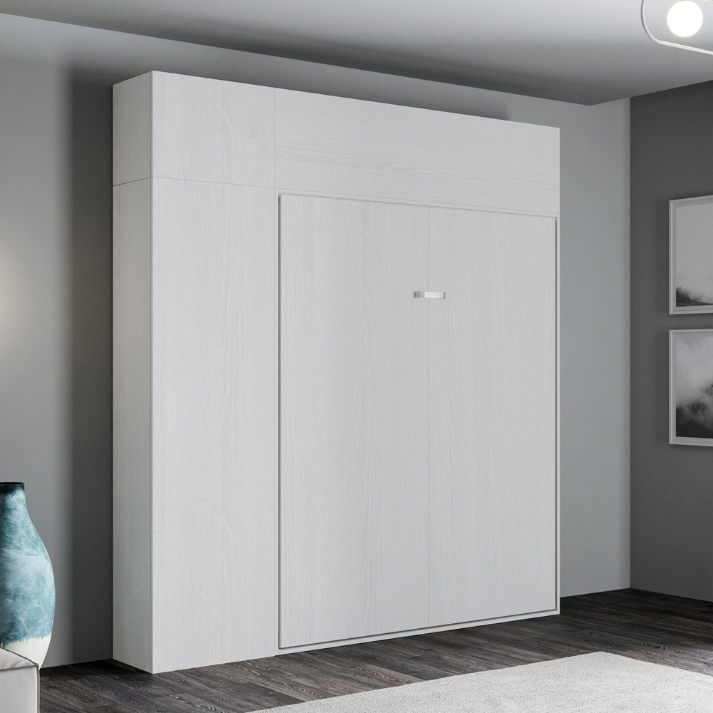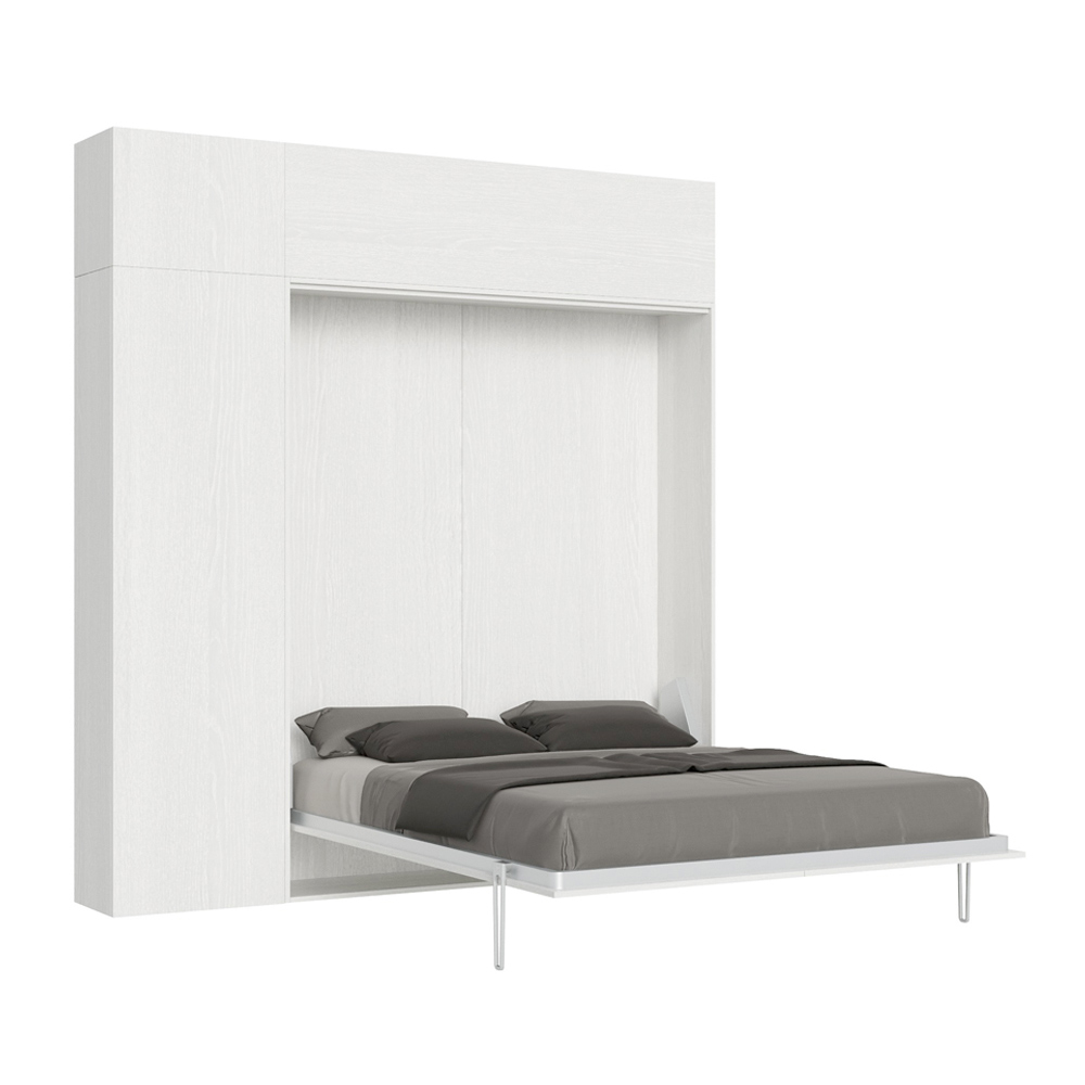 Cama abatible realizada con estructura en paneles de partículas de madera ennoblecidas de 18 mm de espesor, estructura somier en hierro reforzado pintado con polvos epoxídicos en color aluminio gofrado, incorpora somier de láminas de haya de 163x190 cm con cinchas para colchón.