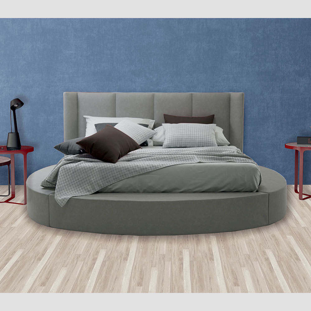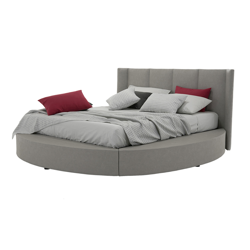 Cama doble de alta calidad con contenedor y somier circular, en tela o ecopiel, hecha a mano en Italia.