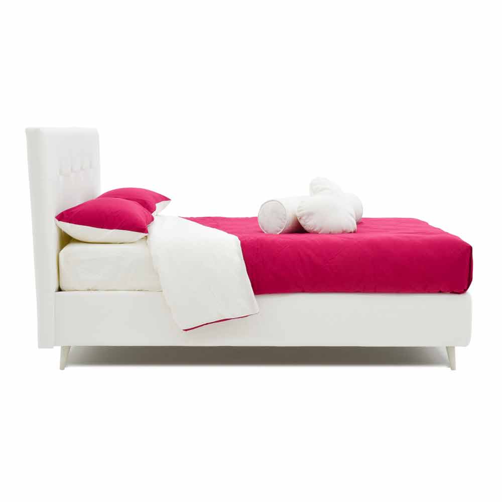 Cama de matrimonio de diseño con patas de madera blanca y tapizado en símil piel Made in Italy.