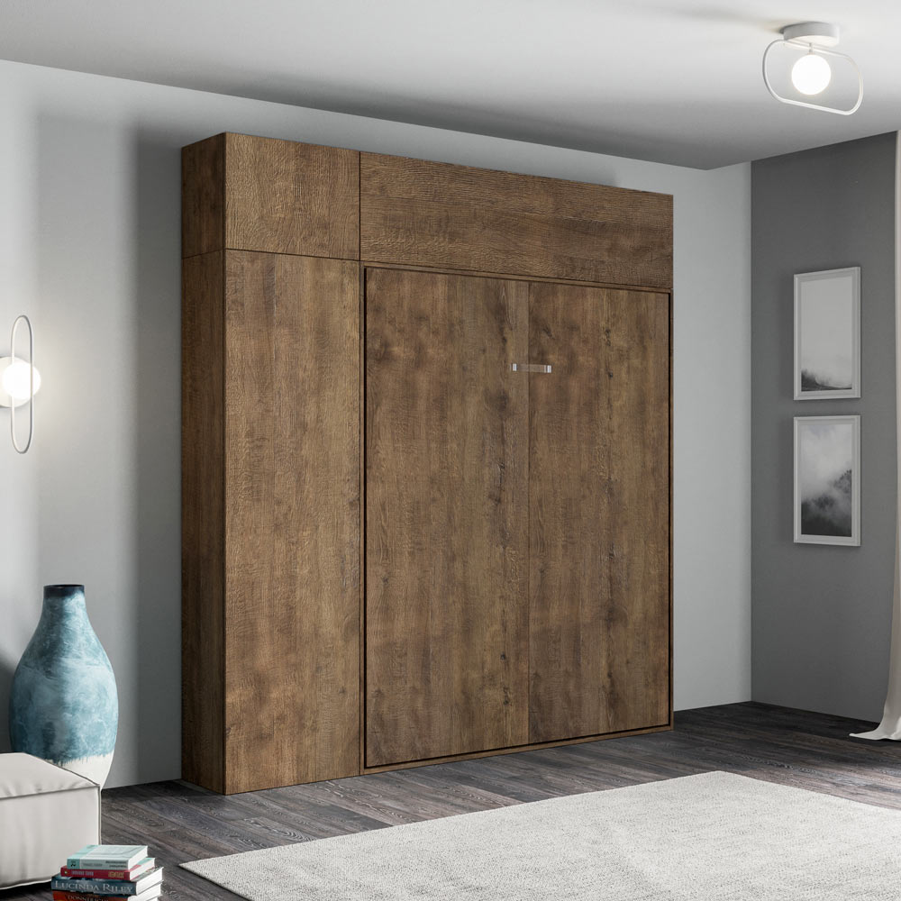Cama abatible realizada con estructura en paneles de partículas de madera ennoblecidas de 18 mm de espesor, estructura somier en hierro reforzado pintado con polvos epoxídicos en color aluminio gofrado, incorpora somier de láminas de haya de 143x190 cm con cinchas para colchón.
