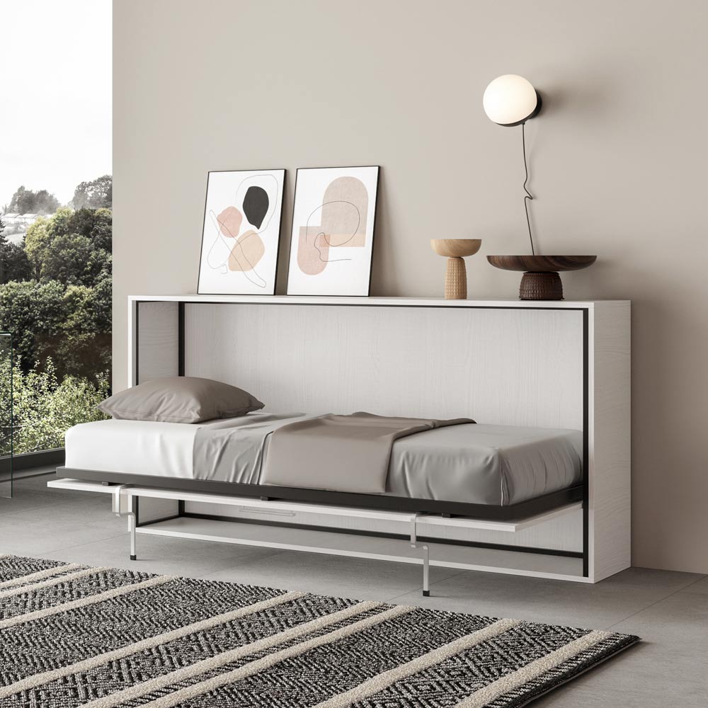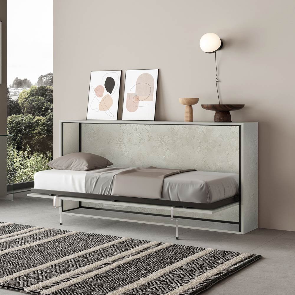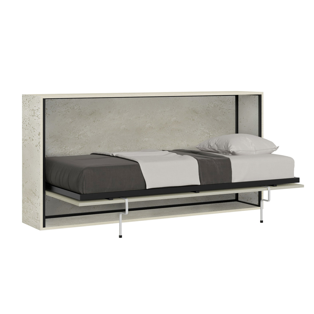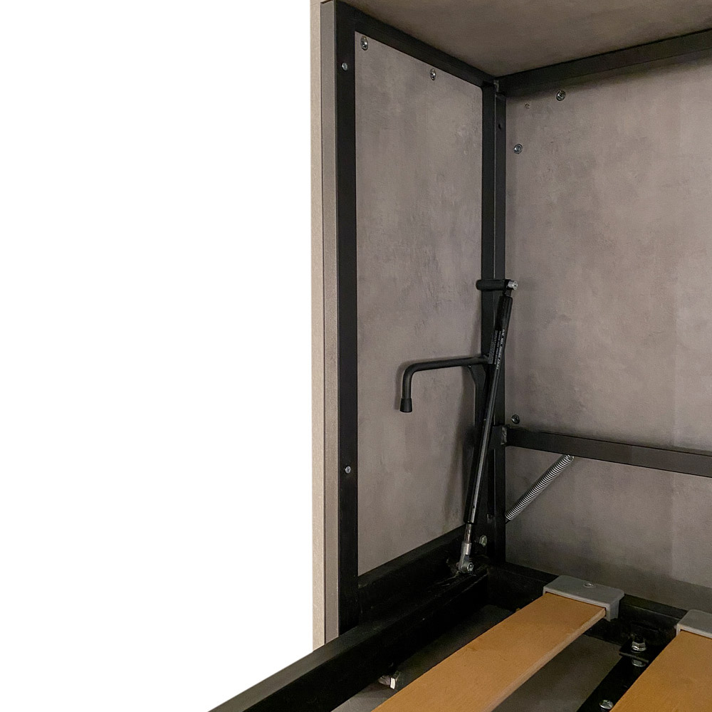 Cama abatible horizontal realizada con estructura en paneles de partículas de madera ennoblecida de 18 mm de espesor, estructura del somier en hierro reforzado pintado con polvo epoxi en color aluminio gofrado. El mecanismo de apertura está equipado con un sistema anti-cierre con bloqueo de seguridad con asas de liberación lateral. La cama se mantiene estable gracias a un mecanismo de seguridad interno que garantiza su rigidez. Al abrir, es necesario extraer manualmente el pie para que la base de la cama descanse en el suelo. El asa incluida facilita el descenso de la cama. Incluye base ortopédica de láminas de madera laminada de 85x190 cm con cinchas para colchón.