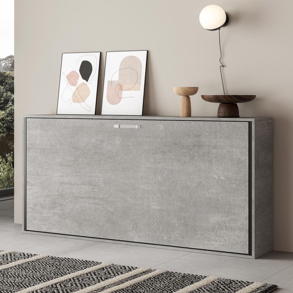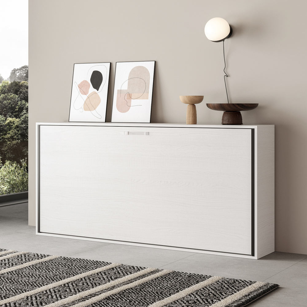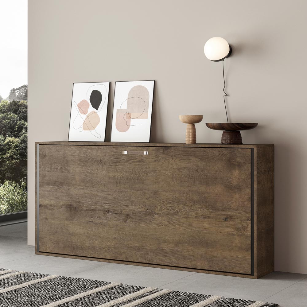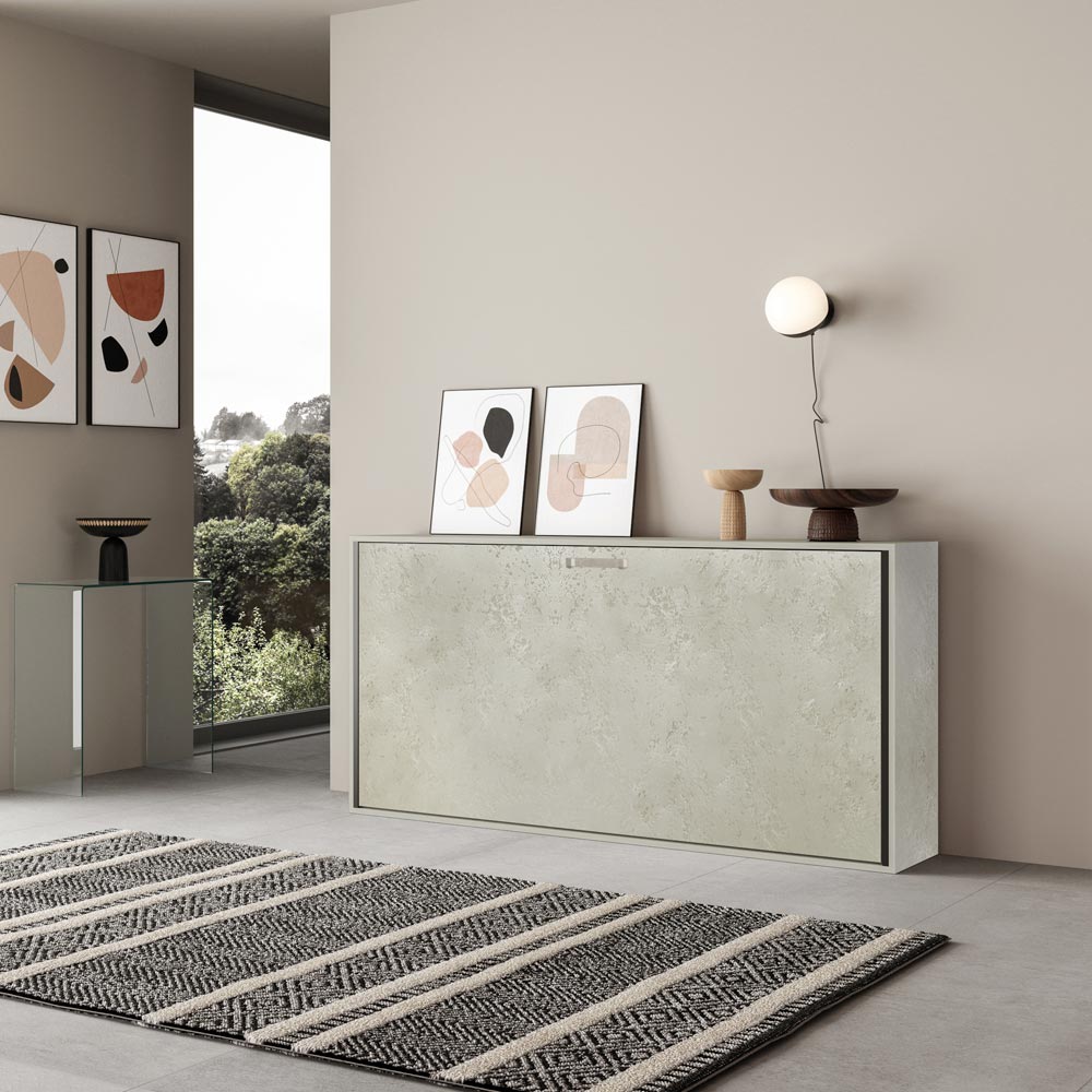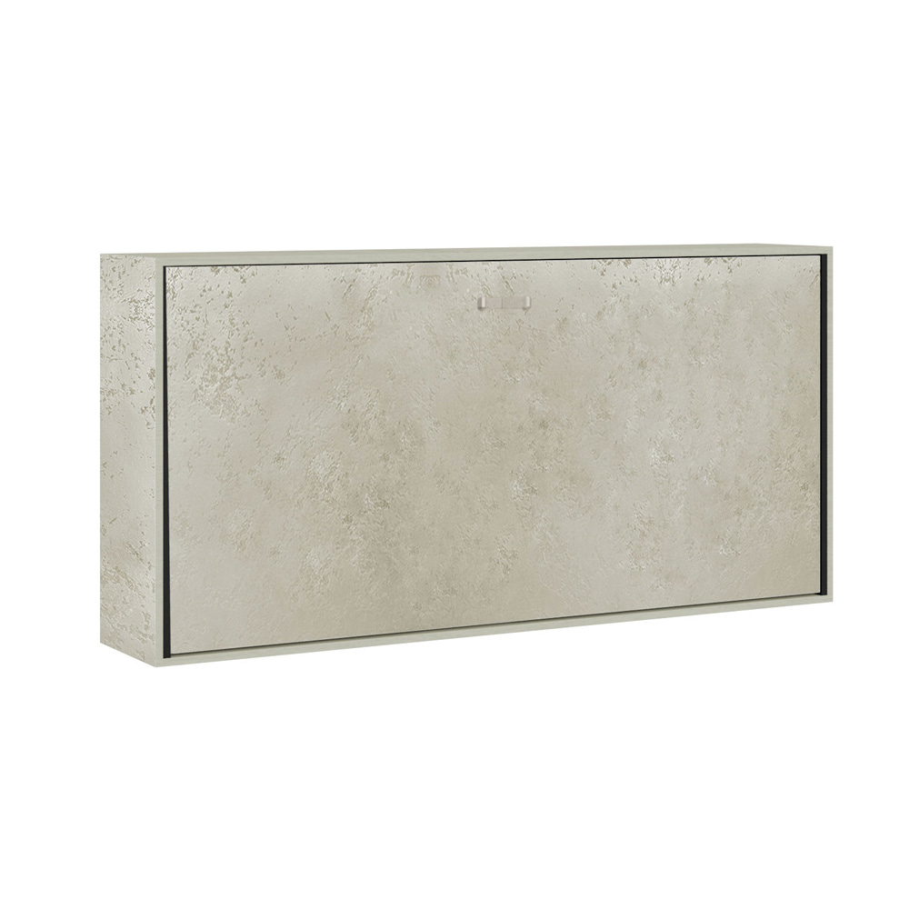 Cama abatible horizontal realizada con estructura en paneles de partículas de madera ennoblecida de 18 mm de espesor, estructura del somier en hierro reforzado pintado con polvo epoxi en color aluminio gofrado. El mecanismo de apertura está equipado con un sistema anti-cierre con bloqueo de seguridad con asas de liberación lateral. La cama se mantiene estable gracias a un mecanismo de seguridad interno que garantiza su rigidez. Al abrir, es necesario extraer manualmente el pie para que la base de la cama descanse en el suelo. El asa incluida facilita el descenso de la cama. Incluye base ortopédica de láminas de madera laminada de 85x190 cm con cinchas para colchón.