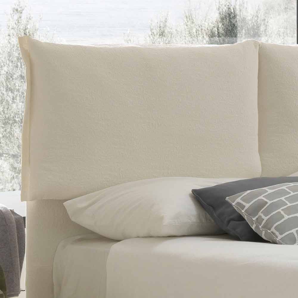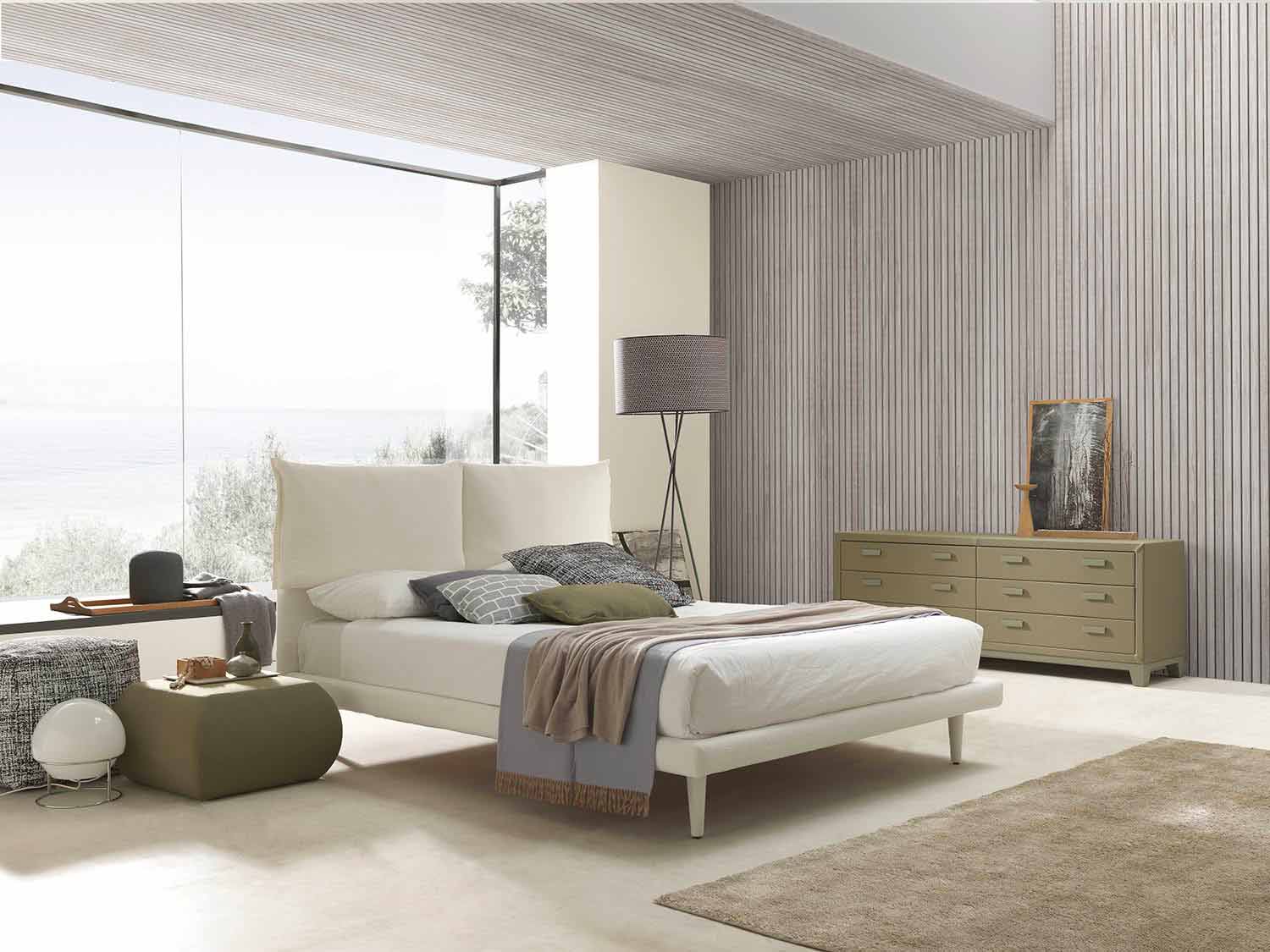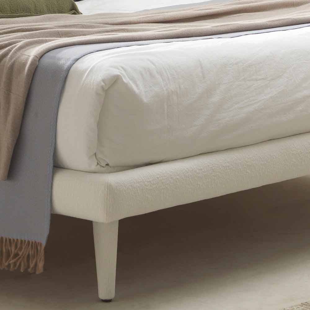 Cama doble de diseño moderno Iorca by Bolzan, fabricada en Italia La cama de matrimonio Iorca se caracteriza por una base fina de 9 cm de altura, que aporta ligereza y sencillez a la estructura. La particularidad de esta cama son los amplios y cómodos cojines del cabecero. Iorca está pensada para hacer del dormitorio un espacio pensado para el relax donde poder disfrutar de agradables momentos de confort. Las líneas suaves y sencillas crean una atmósfera íntima. Además, es completamente desenfundable. La estructura es de MDF espesor mm.40, recubierto de espuma de poliuretano sin clorofluorocarbonos según las normas UNI y revestido de velfodera estable a la luz. La cama se suministra con somier de láminas con estructura de metal, marco curvado con perfil de 50x37 mm pintado con polvos epoxídicos. Somier de láminas ortopédico normal, 15 láminas de madera de haya contrachapada curvada 68x8 mm por cama. Pies de jarrón H 26 cm, lacados en blanco