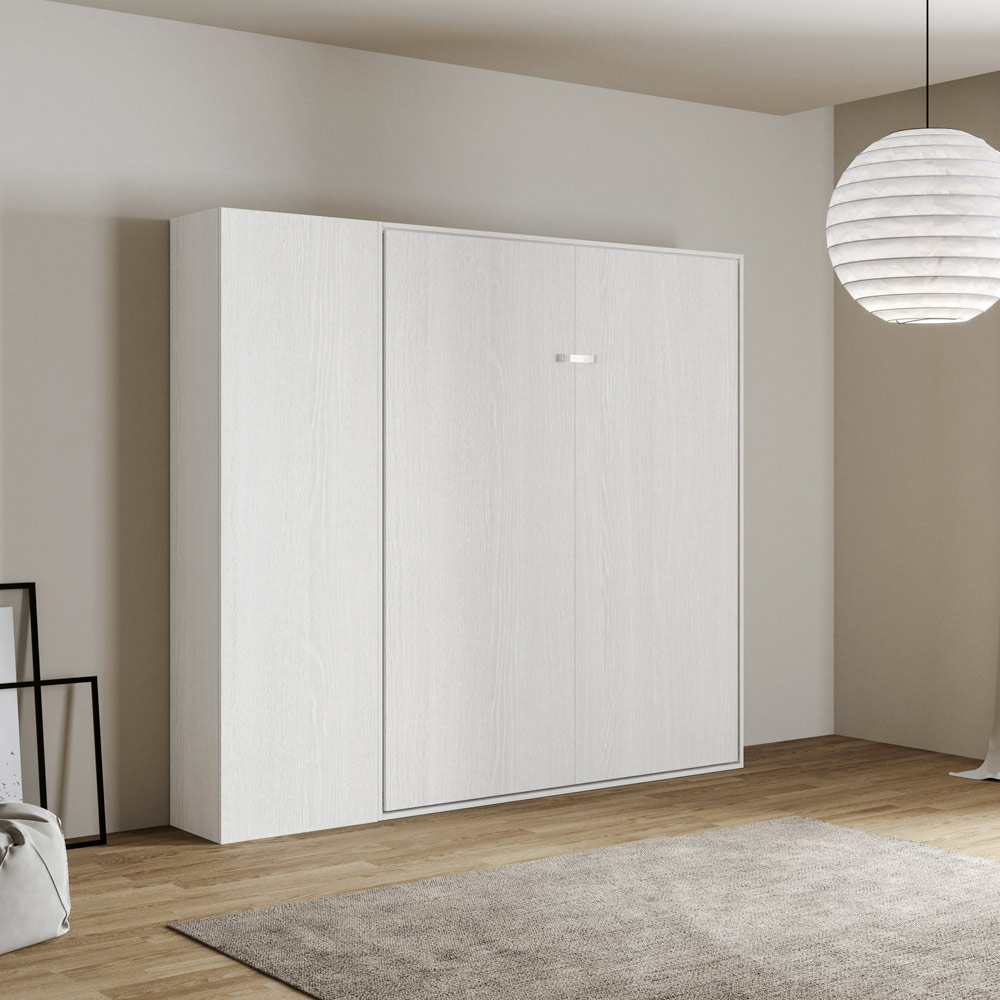 La estructura de la cama está fabricada con tableros de partículas de melamina de 18 mm de espesor , lo que garantiza resistencia y durabilidad. El mecanismo de apertura es suave y seguro, transformando la pared en una cómoda cama con un simple gesto.