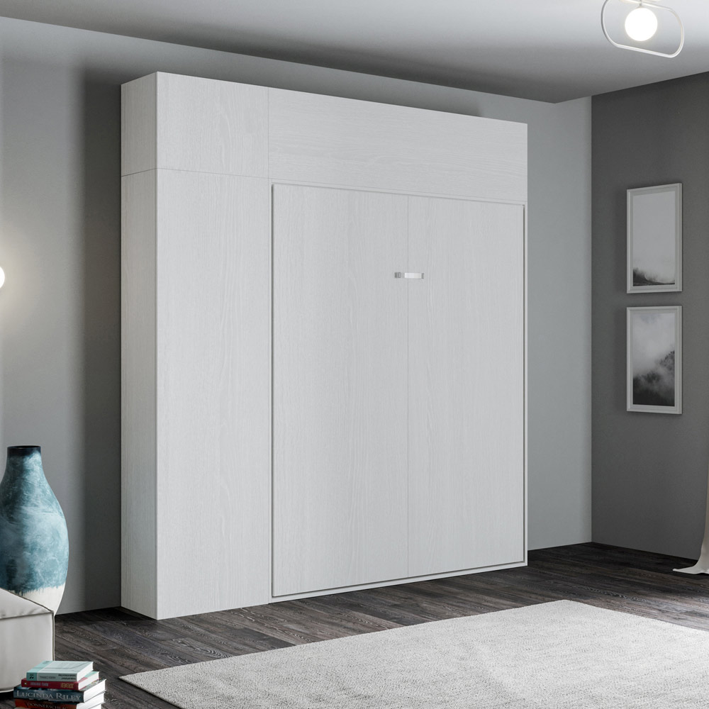 Cama abatible realizada con estructura en paneles de partículas de madera ennoblecidas de 18 mm de espesor, somier de estructura en hierro reforzado pintado con polvos epoxídicos en color aluminio gofrado, incorpora somier de láminas de haya de 123x190 cm con cinchas para colchón.