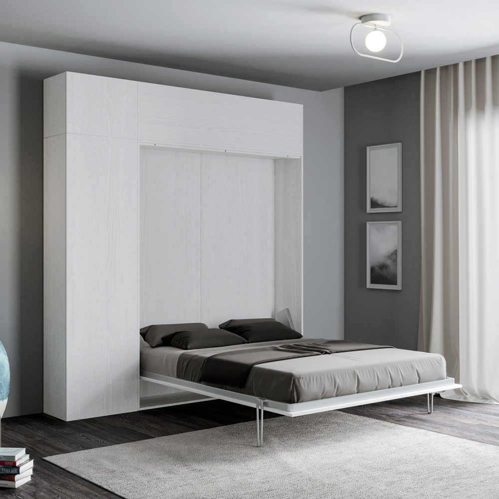 La estructura de la cama está fabricada con tableros de partículas de melamina de 18 mm de espesor , lo que garantiza resistencia y durabilidad. El mecanismo de apertura es suave y seguro, transformando la pared en una cómoda cama con un simple gesto.