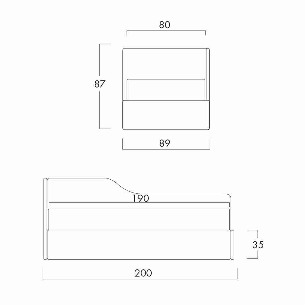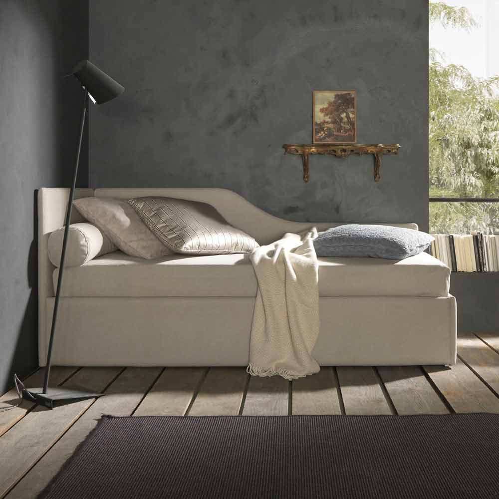 Cama individual con cabecero moldeado, Línea 8 de Bolzan, fabricada en Italia Line es un clásico refinado, de rasgos distintivos y sobrios. Su composición es delicada, con capacidad de adaptarse a cualquier tipo de ambiente. Line sigue evoluciones estilísticas y funcionales. La cama individual Line 8 tiene una estructura de hierro y fibra de madera en bruto, revestida de espuma de poliuretano sin clorofluorocarbonos según las normas UNI y revestida con velfodera estable a la luz. Sobre esta base se monta una estructura de metal de 30 mm de altura pintada con polvos epoxídicos termoendurecibles, con un somier de láminas de haya curvada al vapor. La cama está disponible en los siguientes tamaños: - 80x190 cm (dimensiones terminadas L 91 x P 200 x H 87 cm) -90x200 cm (dimensiones terminadas L 101 x P 210 x H 87 cm)