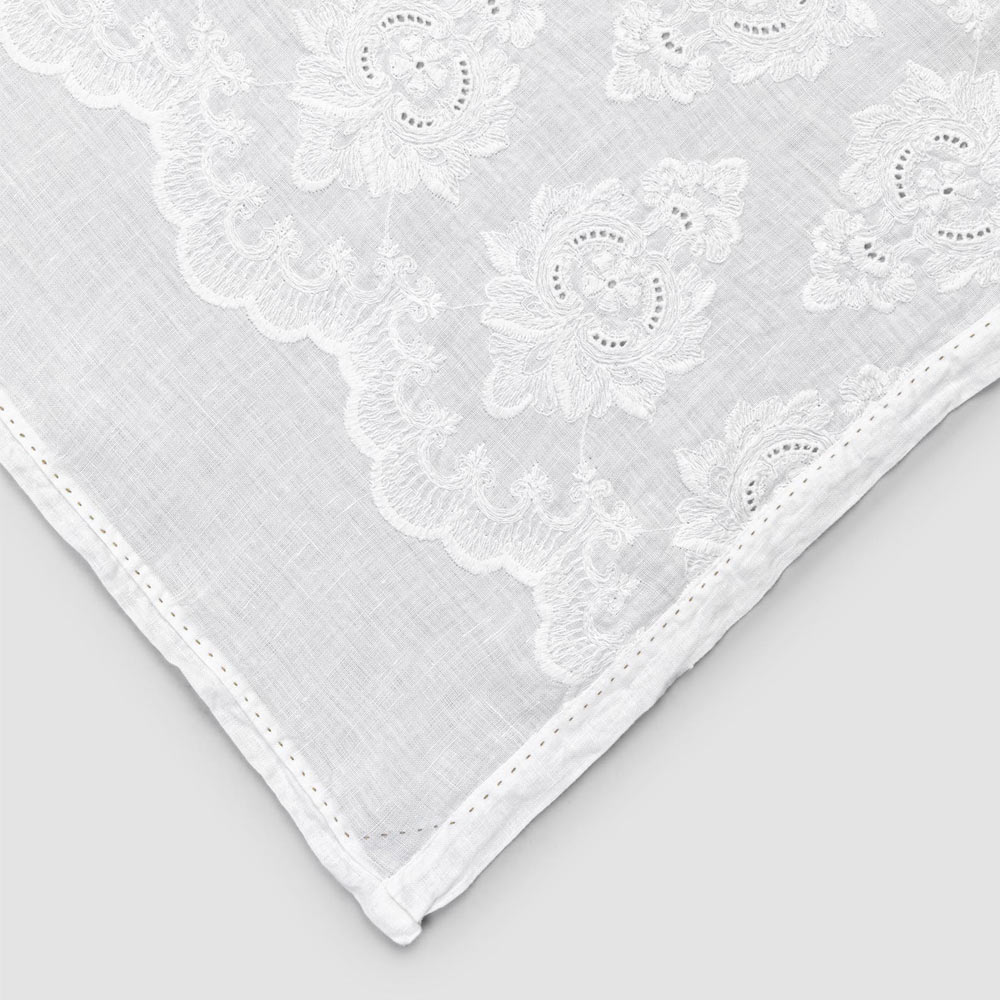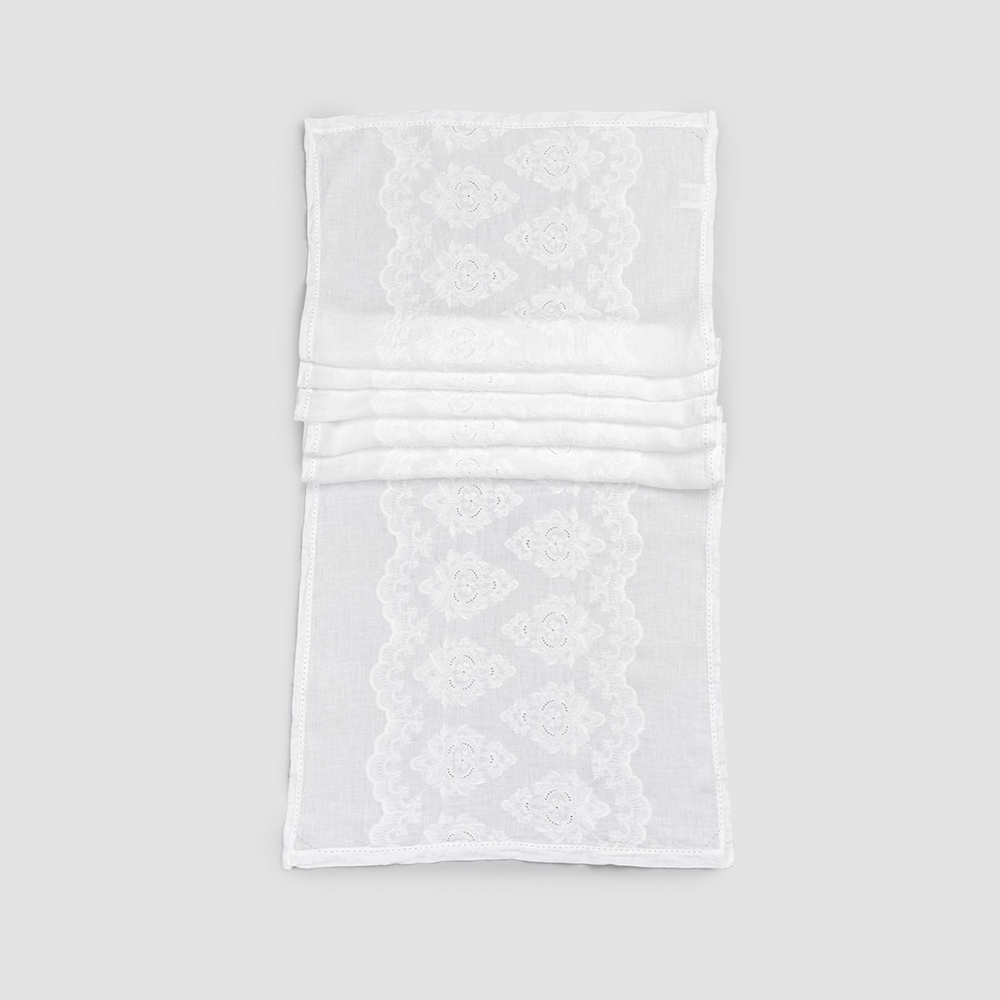El valor de la tradición se combina con el estilo de vida moderno en este camino de mesa de lino blanco con bordes doblados y bordado de algodón .