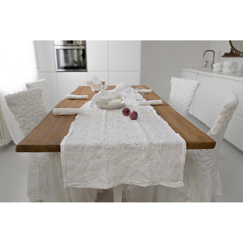 Camino de mesa de puro lino con bordado de algodón, diseño elegante de lujo made in Italy.