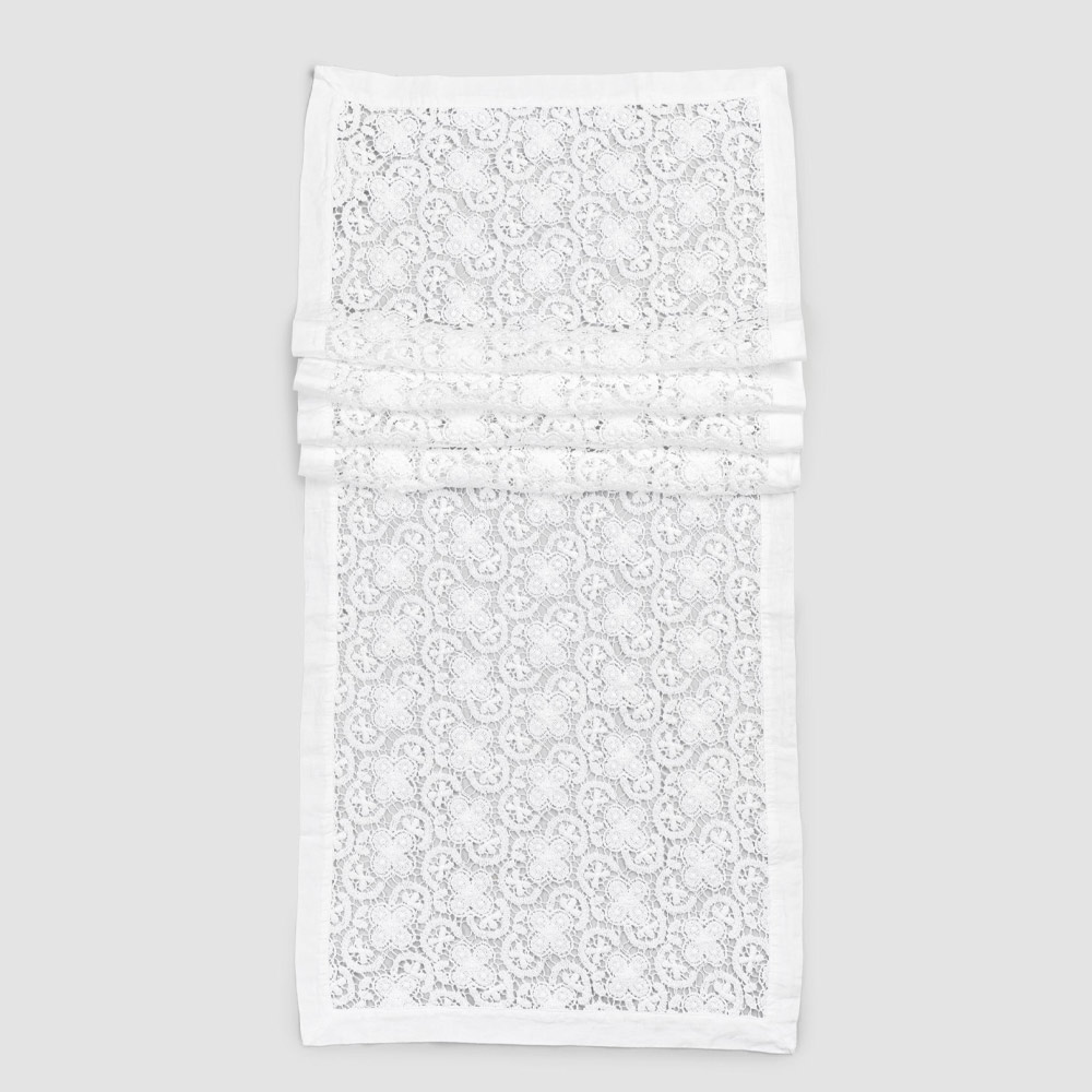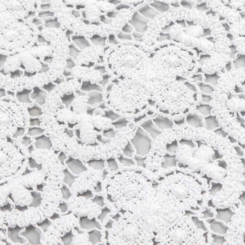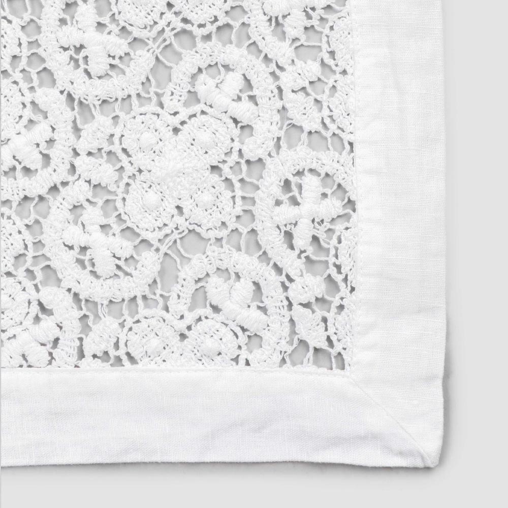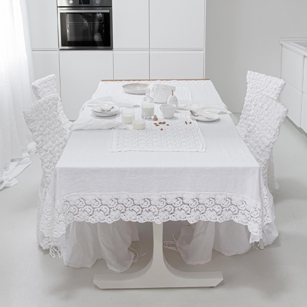 El valor de la tradición se une al estilo de vida moderno con este camino de mesa de alta calidad suavizado al tacto gracias a tratamientos especiales que realzan el aspecto natural. El corredor de decoración blanco está completamente bordado en encaje de crochet y presenta un borde de mezcla de lino y algodón con pliegue. Ligereza , libertad, elegancia y pureza son las palabras clave contenidas en este producto de noble encanto y fino tejido .